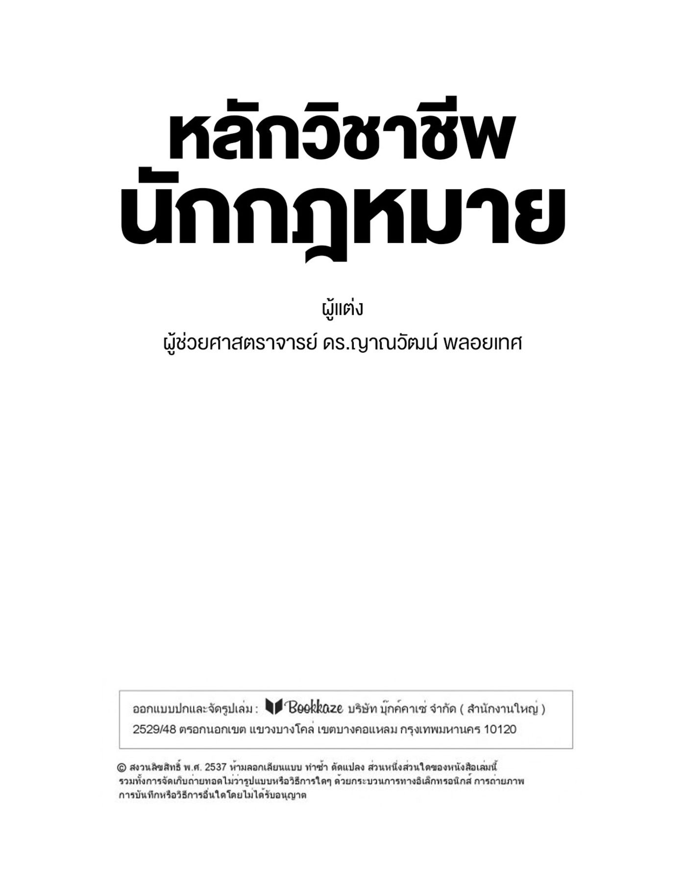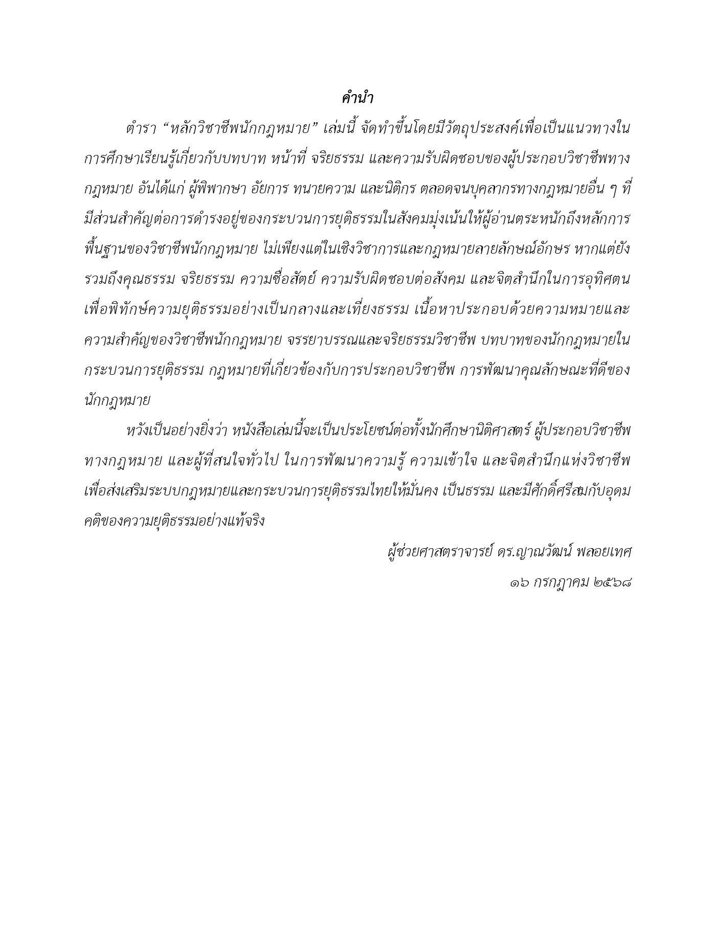 ตํารา “หลักวิชาชีพนักกฎหมาย” เล่มนี้ จัดทำขึ้นโดยมีวัตถุประสงค์เพื่อเป็นแนวทางในการศึกษาเรียนรู้เกี่ยวกับบทบาท หน้าที่ จริยธรรม และความรับผิดชอบของผู้ประกอบวิชาชีพทางกฎหมาย อันได้แก่ ผู้พิพากษา อัยการ ทนายความ และนิติกร ตลอดจนบุคลากรทางกฎหมายอื่น ๆ ที่มีส่วนสำคัญต่อการดำรงอยู่ของกระบวนการยุติธรรมในสังคม