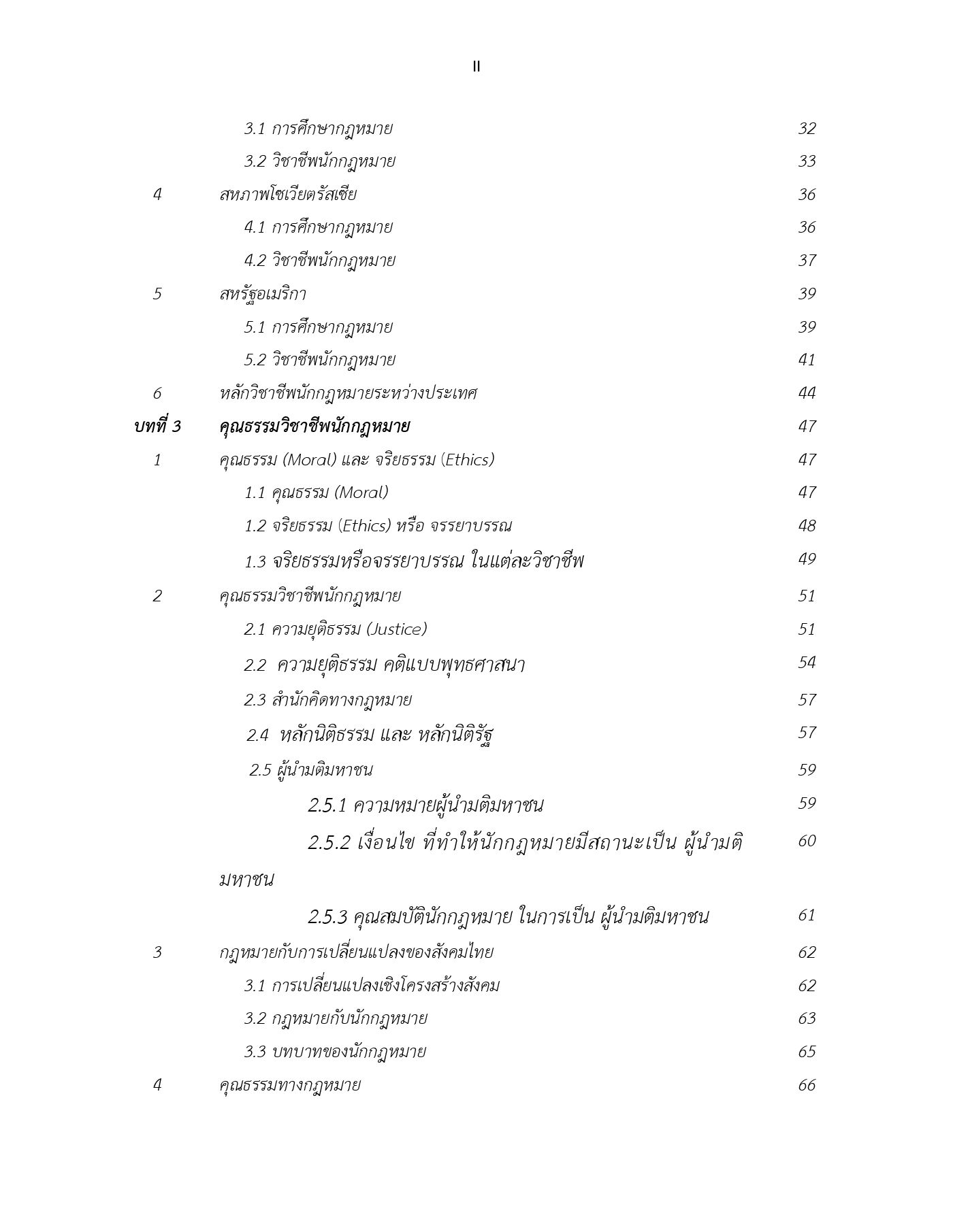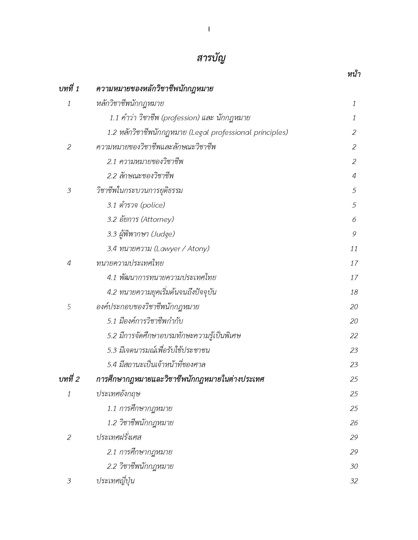 เนื้อหาประกอบด้วยความหมายและความสำคัญของวิชาชีพนักกฎหมาย จรรยาบรรณและจริยธรรมวิชาชีพ บทบาทของนักกฎหมายในกระบวนการยุติธรรม กฎหมายที่เกี่ยวข้องกับการประกอบวิชาชีพ และการพัฒนาคุณลักษณะที่ดีของนักกฎหมาย