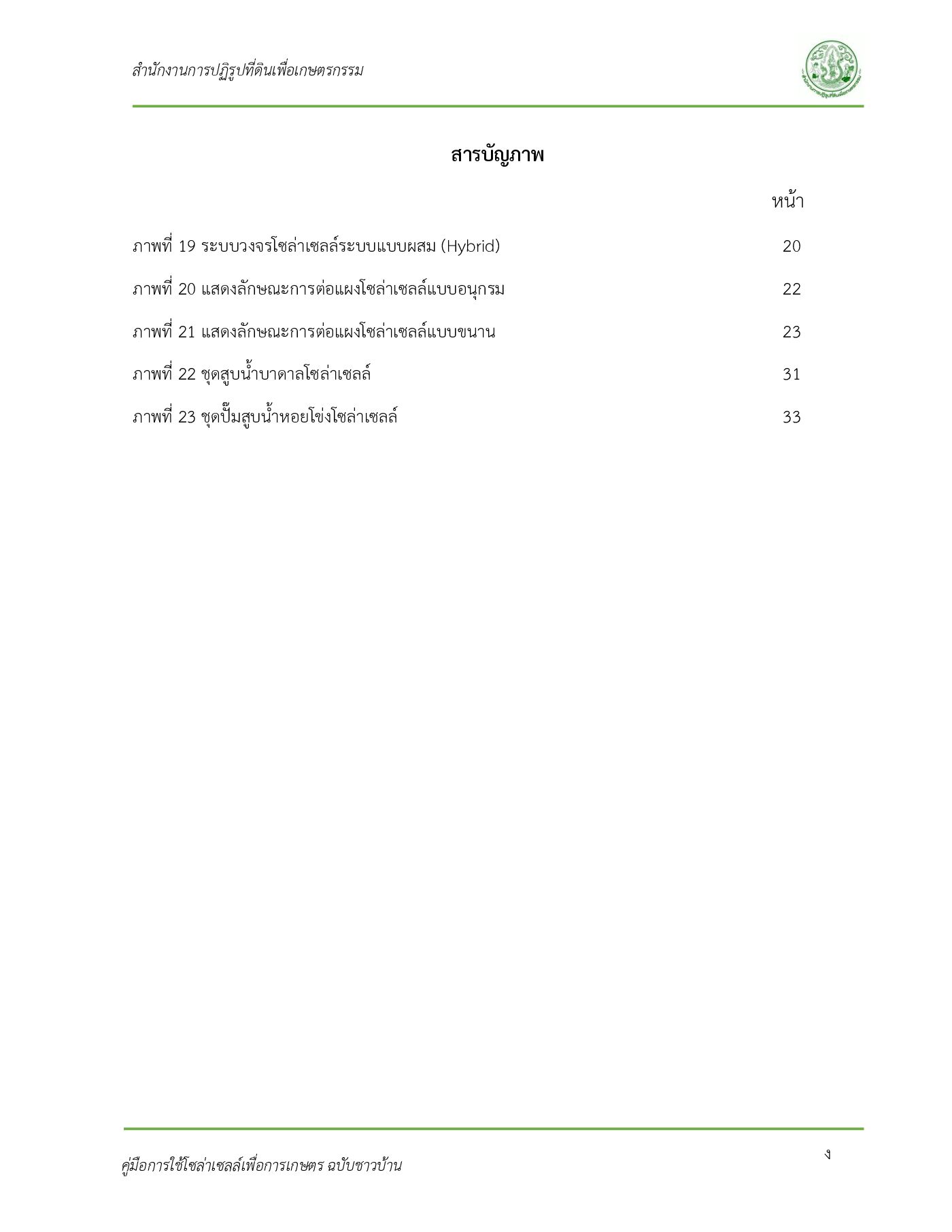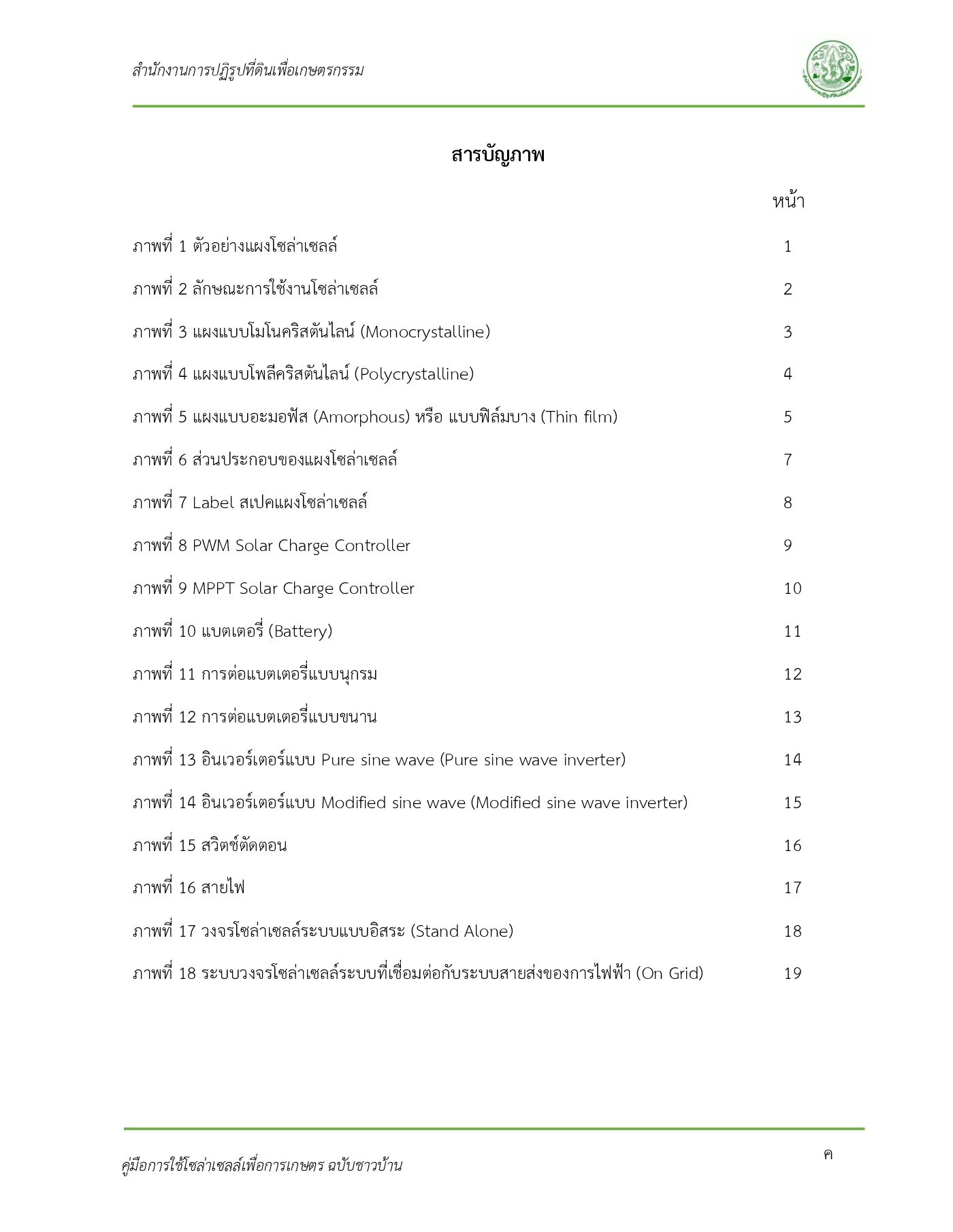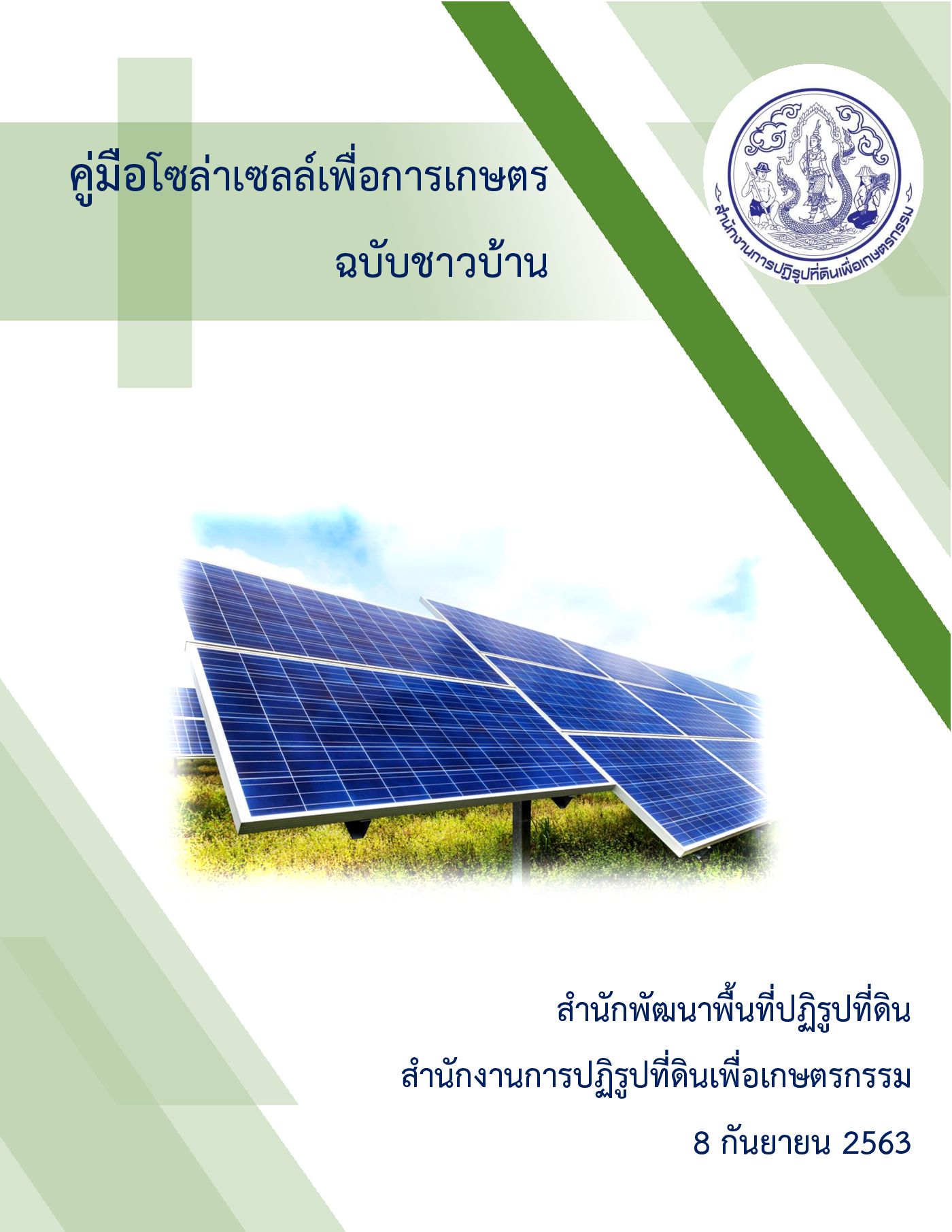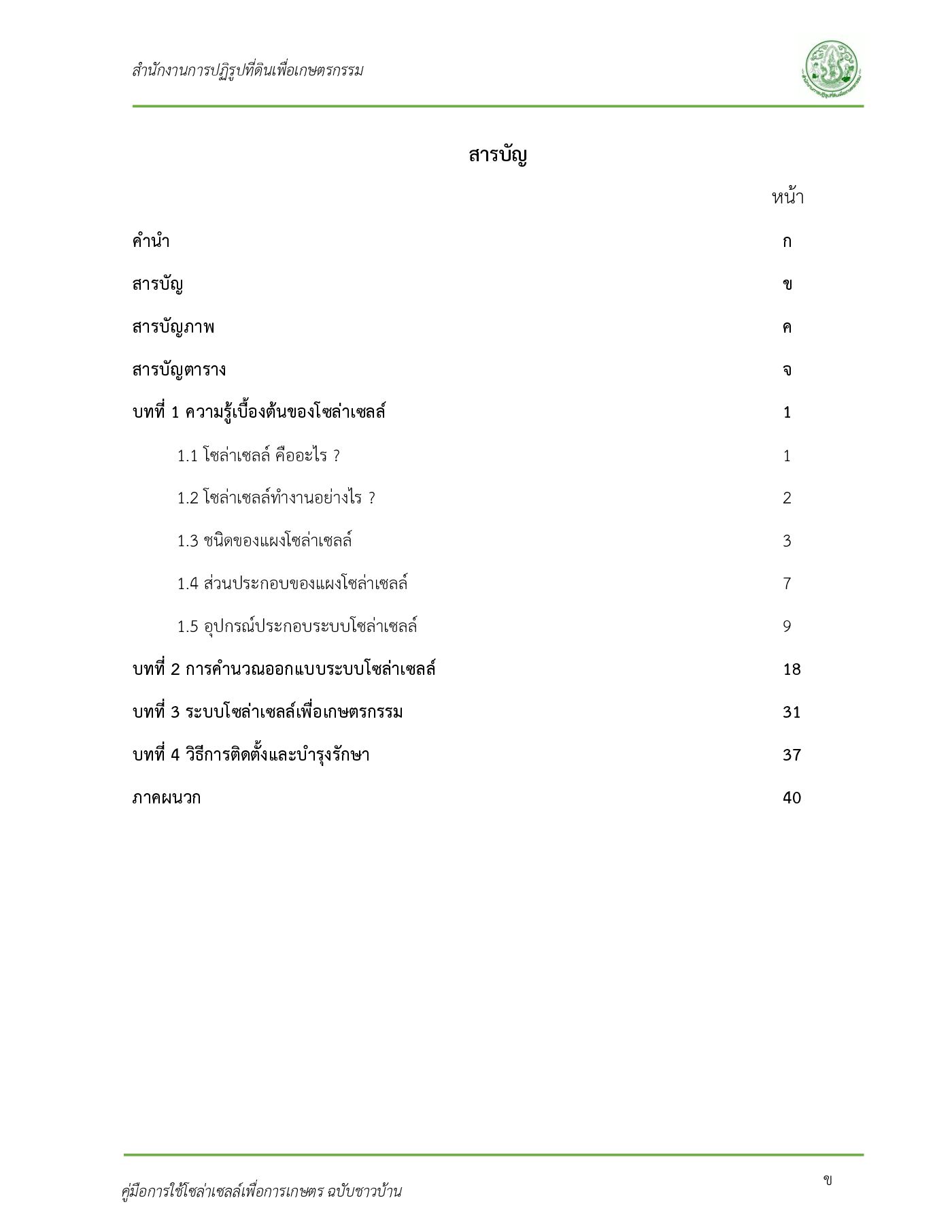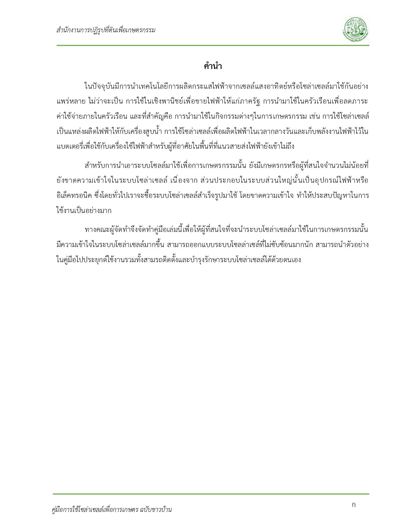 ทางคณะผู้จัดทําจึงจัดทําคู่มือเล่มนี้เพื่อให้ผู้ที่สนใจที่จะนําระบบโซล่าเซลล์มาใช้ในการเกษตรกรรมนั้น มีความเข้าใจในระบบโซล่าเซลล์มากข้ึน สามารถออกแบบระบบโซลล่าเซล์ที่ไม่ซับซ้อนมากนัก สามารถนําตัวอย่าง ในคู่มือไปประยุกต์ใช้งานรวมทั้งสามรถติดตั้งและบํารุงรักษาระบบโซล่าเซลล์ได้ด้วยตนเอง
