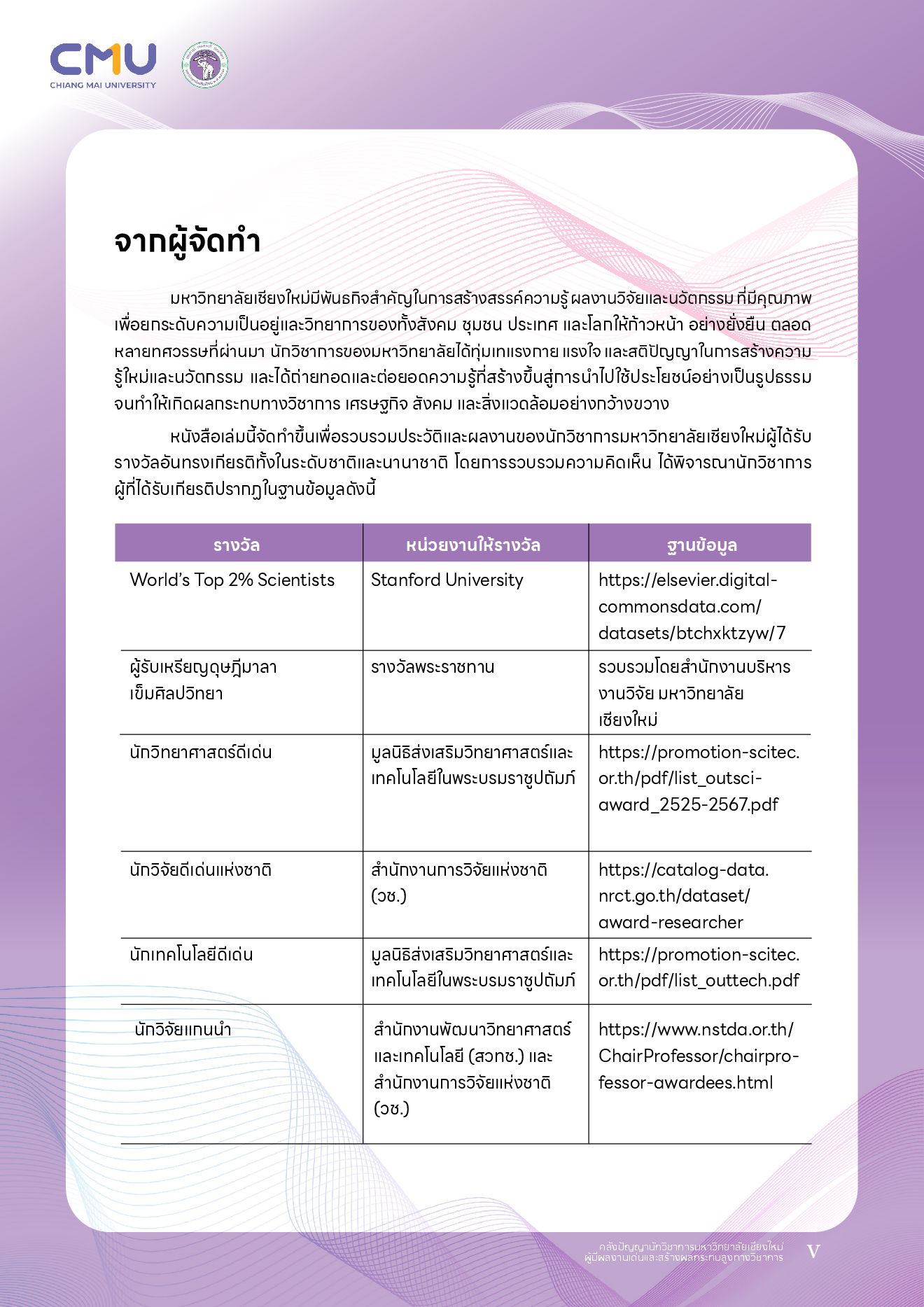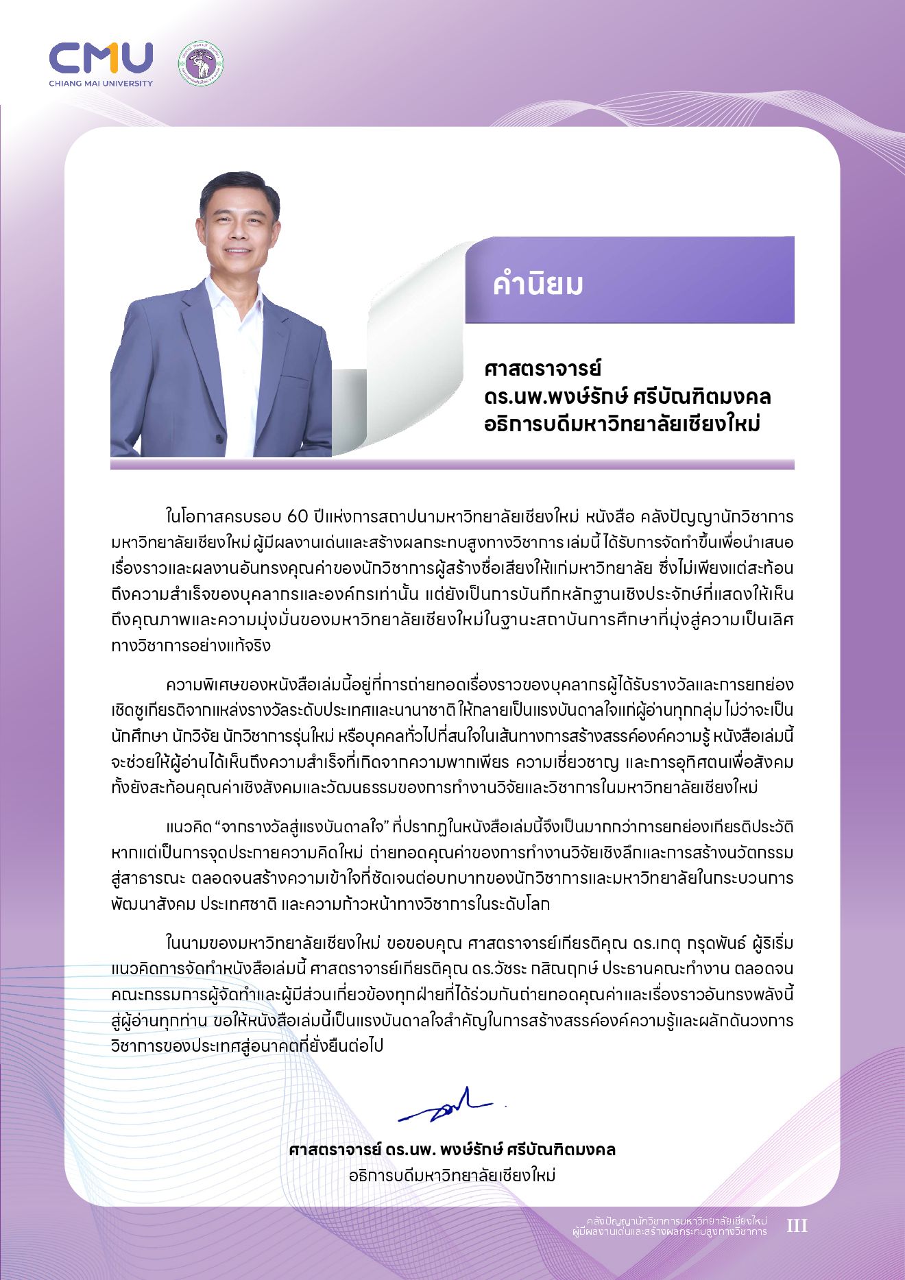 หนังสือเล่มนี้จัดทำขึ้นเพื่อรวบรวมประวัติและผลงานของนักวิชาการมหาวิทยาลัยเชียงใหม่ผู้ได้รับรางวัลอันทรงเกียรติทั้งในระดับชาติและนานาชาติ จำนวน 88 ท่าน ศาสตราจารย์เกียรติคุณ ดร. อานันท์ กาญจนพันธ์ ได้กรุณาสังเคราะห์ประเด็นงานวิจัยของนักวิชาการดังกล่าวได้เป็นประเด็นวิจัยร่วม 8 ประเด็น ได้แก่ คือ 1. ด้านวิทยาศาสตร์สุขภาพและนวัตกรรมทางการแพทย์ 2. ด้านเกษตรยั่งยืนและความมั่นคงทางเศรษฐกิจ 3.ด้านปัญหาสิ่งแวดล้อมและโรคระบาด 4. ด้านพลังงานทางเลือกเพื่อลดสภาวะโรคร้อน 5. การเกลุ่มเปราะบางและการมีส่วนร่วมทางสังคมการเมือง 6. ด้านวัฒนธรรมและประวัติศาสตร์ท้องถิ่น 7. ด้านการพัฒนาเทคโนโลยีและงชีวิตสมัยใหม่ 8. การสังเคราะห์ความรู้ใหม่เกี่ยวกับโลกสีเขียวและความยั่งยืนในทุกมิติ ผู้จัดทำฯ หวังเป็นอย่างยิ่งว่าหนังสือที่ปรากฎนี้จะเป็นประโยชน์ตามวัตถุประสงค์ที่ตั้งไว้ คือ • ถ่ายทอดและสร้างแรงบันดาลใจให้แก่นักวิจัยรุ่นใหม่และผู้สนใจในวิชาการ • แสดงให้เห็นถึงผลกระทบเชิงบวกของงานวิจัยที่สะท้อนถึงพลังของความรู้และนวัตกรรม • เป็นฐานข้อมูลเชิงกลยุทธ์ที่ผู้บริหารมหาวิทยาลัยสามารถนำไปใช้ประกอบการกำหนดทิศทางและวางแผนวิจัยในอนาคต
