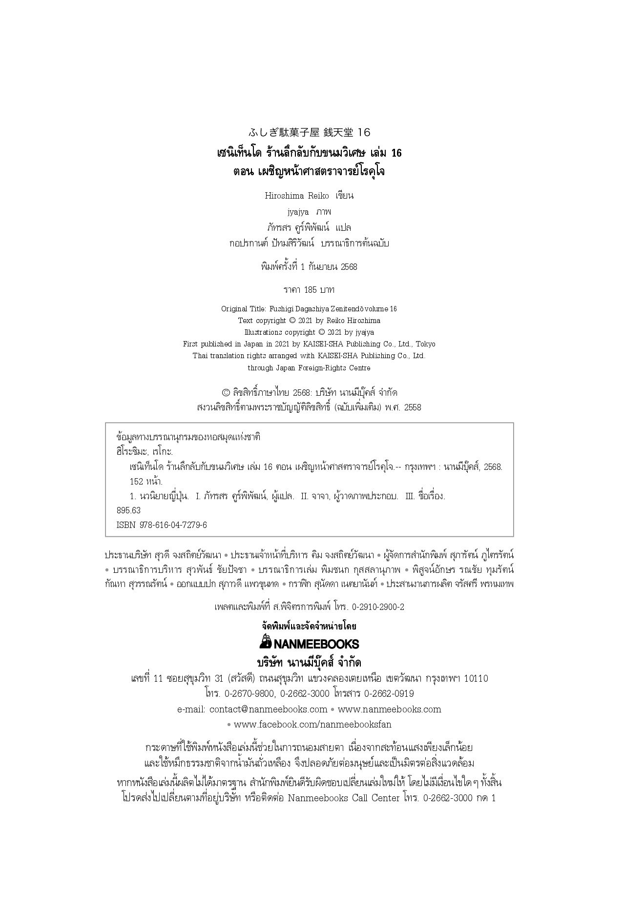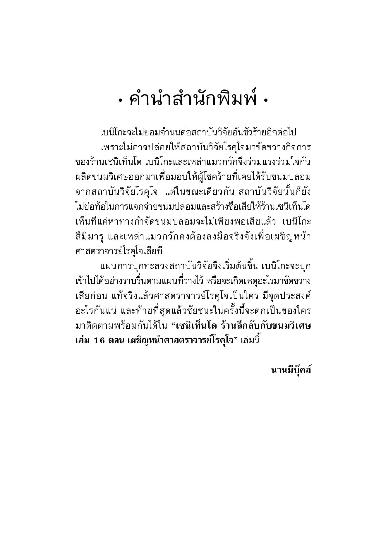 บนิโกะวางแผนกับเหล่าแมวกวักเพื่อตอบโต้สถาบันวิจัยโรคุโจที่บ่อนทำลายร้านเซนิเท็นโดมาตลอด รวมถึงออกไปตามหาคุณลูกค้าผู้ได้รับขนมของปลอมเพื่อช่วยเหลือคนเหล่านั้นจากเคราะห์ร้ายโดยมอบสินค้าที่มีพลังวิเศษให้แทน ไม่ว่าจะเป็น “นักเกตของดี” ซึ่งบันดาลให้ได้รับของดีเลิศกว่าผู้อื่นเสมอ หรือ “ขิงนินจา” ซึ่งช่วยให้มีทักษะอำพรางตัวและปีนป่ายได้ดั่งนินจา สุดท้ายเบนิโกะจะตามหาสถาบันวิจัยโรคุโจเจอหรือไม่ และแผนโต้กลับศาสตราจารย์โรคุโจจะจบลงเช่นไร มาตามลุ้นใน “เชนิเท็นโด ร้านลึกลับกับขนมวิเศษ เล่ม 16 ตอน เผชิญหน้าศาสตราจารย์โรคุโจ” ไปด้วยกัน