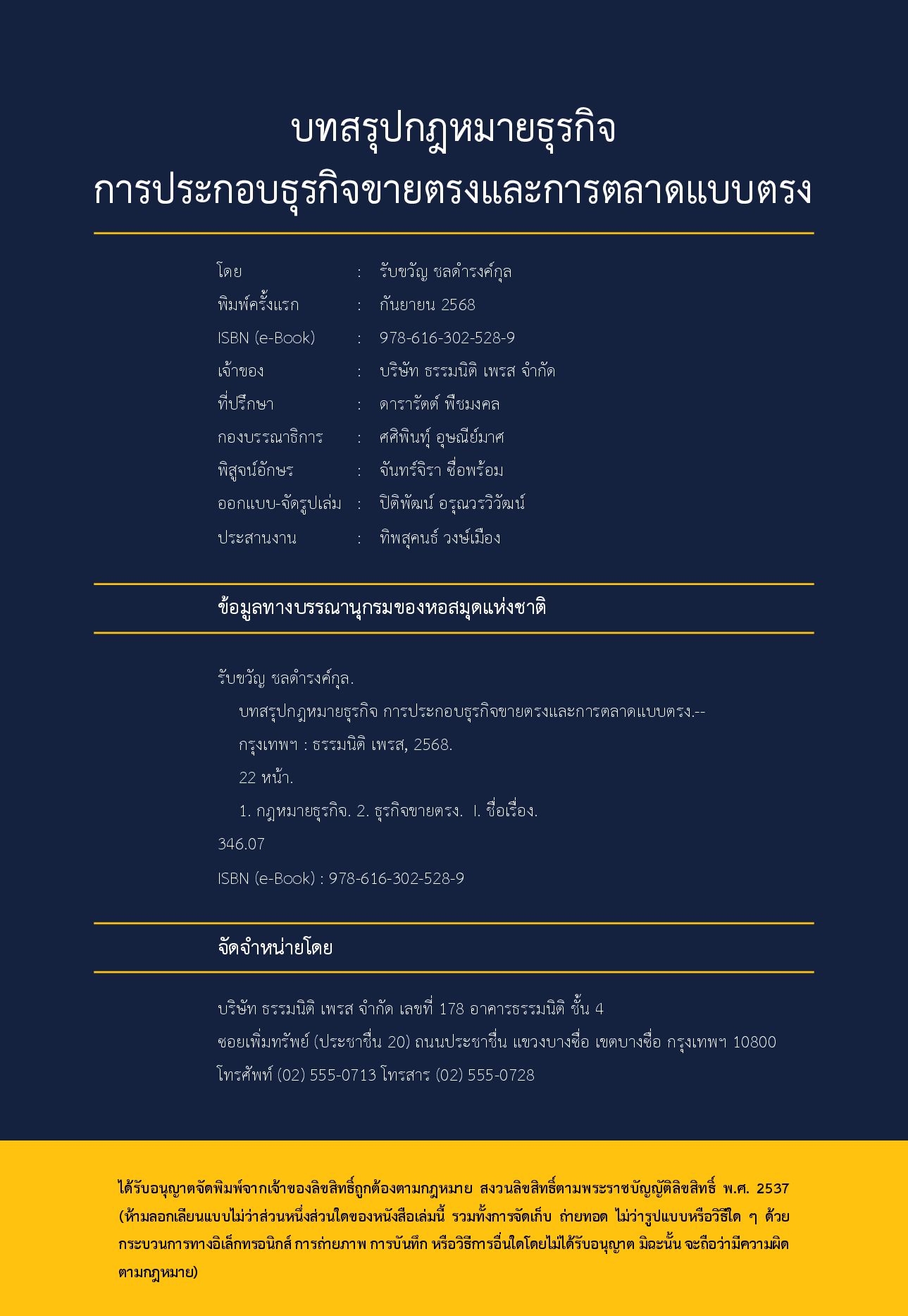 เปิดประตูสู่ความสำเร็จทางธุรกิจที่ไร้ความเสี่ยง คู่มือฉบับย่อ “กฎหมายธุรกิจขายตรงและตลาดแบบตรง” เล่มนี้จะช่วยให้คุณเข้าใจประเด็นสำคัญทางกฎหมายที่ซับซ้อนให้กลายเป็นเรื่องง่าย อธิบายถึงความแตกต่างระหว่างการขายตรงและการตลาดแบบตรง พร้อมแนะแนวทางปฏิบัติที่ถูกต้องตามกฎหมาย เพื่อช่วยให้ผู้ประกอบการดำเนินธุรกิจได้อย่างมั่นใจ รวมถึงนักกฎหมายที่ต้องให้คำปรึกษาได้ใช้ในการตรวจสอบและป้องกันความเสี่ยงที่อาจเกิดขึ้นได้อย่างมีประสิทธิภาพ