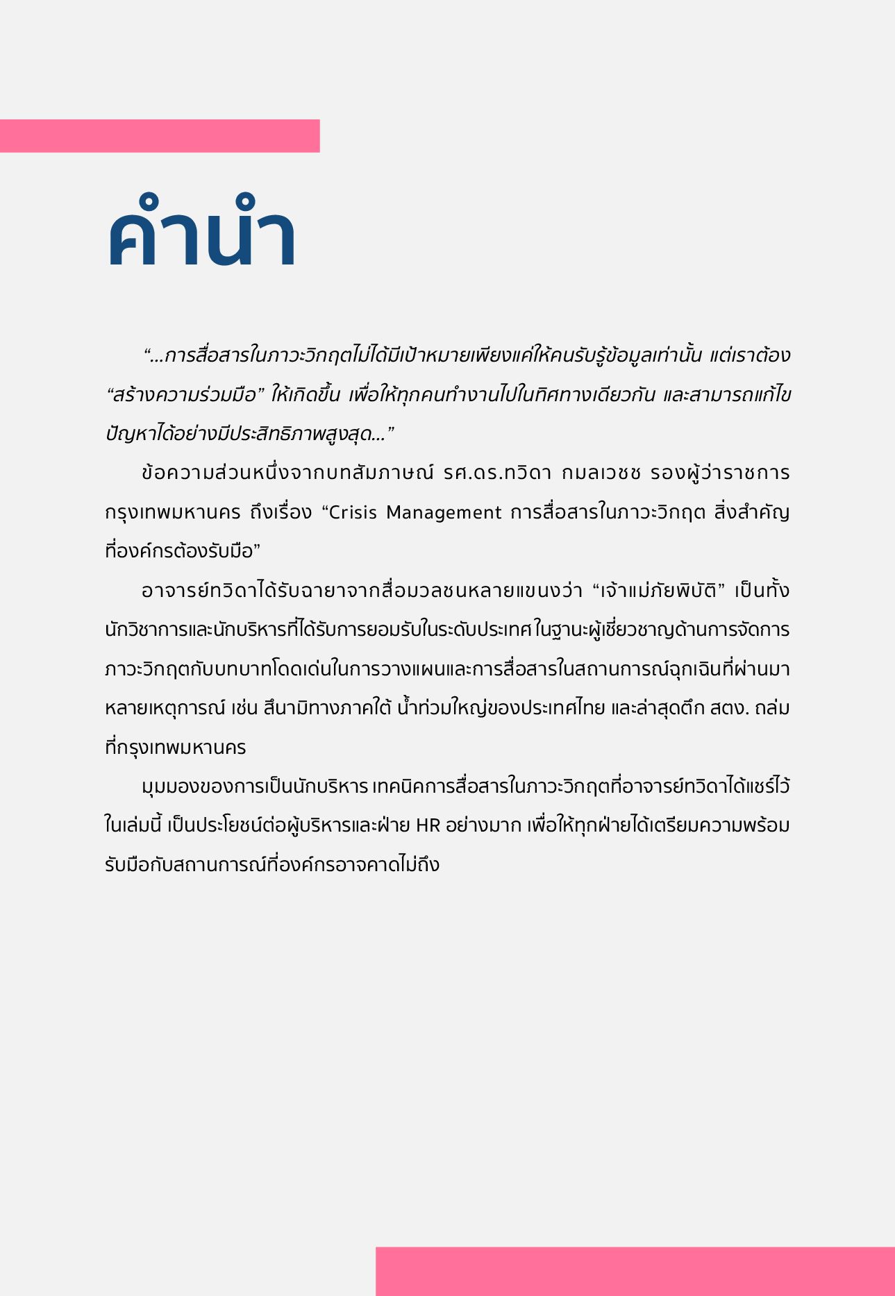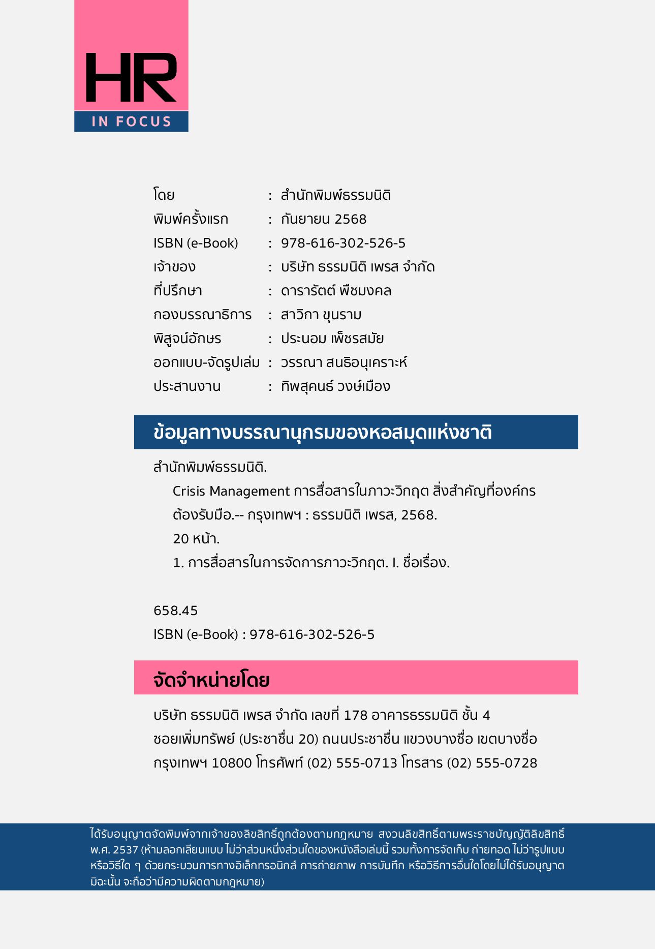 ถอดรหัสวิกฤต! บทเรียนจาก “เจ้าแม่ภัยพิบัติ” รศ.ดร.ทวิดา กมลเวชช รองผู้ว่าราชการกรุงเทพมหานคร ผู้เชี่ยวชาญด้านการจัดการภาวะวิกฤตระดับประเทศ! ที่มาเผยเทคนิคการบริหารจัดการ การวางแผน และการสื่อสารในสถานการณ์ฉุกเฉิน ที่ผ่านเหตุการณ์ใหญ่ทั้งสึนามิ น้ำท่วมใหญ่ และเหตุตึกถล่ม! เนื้อหาในเล่มนี้จึงเป็นประโยชน์ต่อผู้บริหารและฝ่าย HR เป็นอย่างยิ่ง เพื่อให้ทุกองค์กรได้เตรียมพร้อมรับมือกับความไม่แน่นอนได้อย่างมั่นใจ