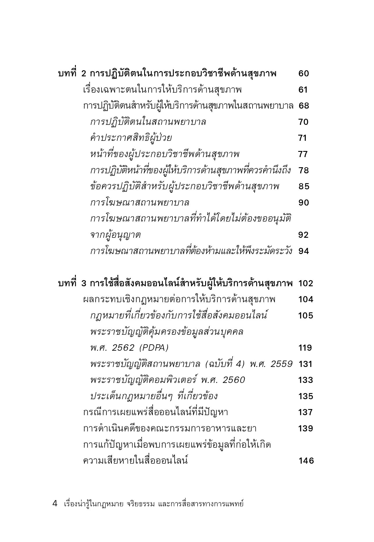 หนังสือเล่มนี้ได้นำเสนอเรื่องน่ารู้ของกฎหมาย จริยธรรมทางการแพทย์ และทักษะการสื่อสารทางการแพทย์แบบที่บุคลากรทางการแพทย์สามารถนำไปใช้ในการทำงานได้และยังช่วยให้ประชาชนทั่วไปเข้าใจสิทธิ บทบาท หน้าที่ทั้งของตนเองและบุคลากรทางการแพทย์ได้มากขึ้น