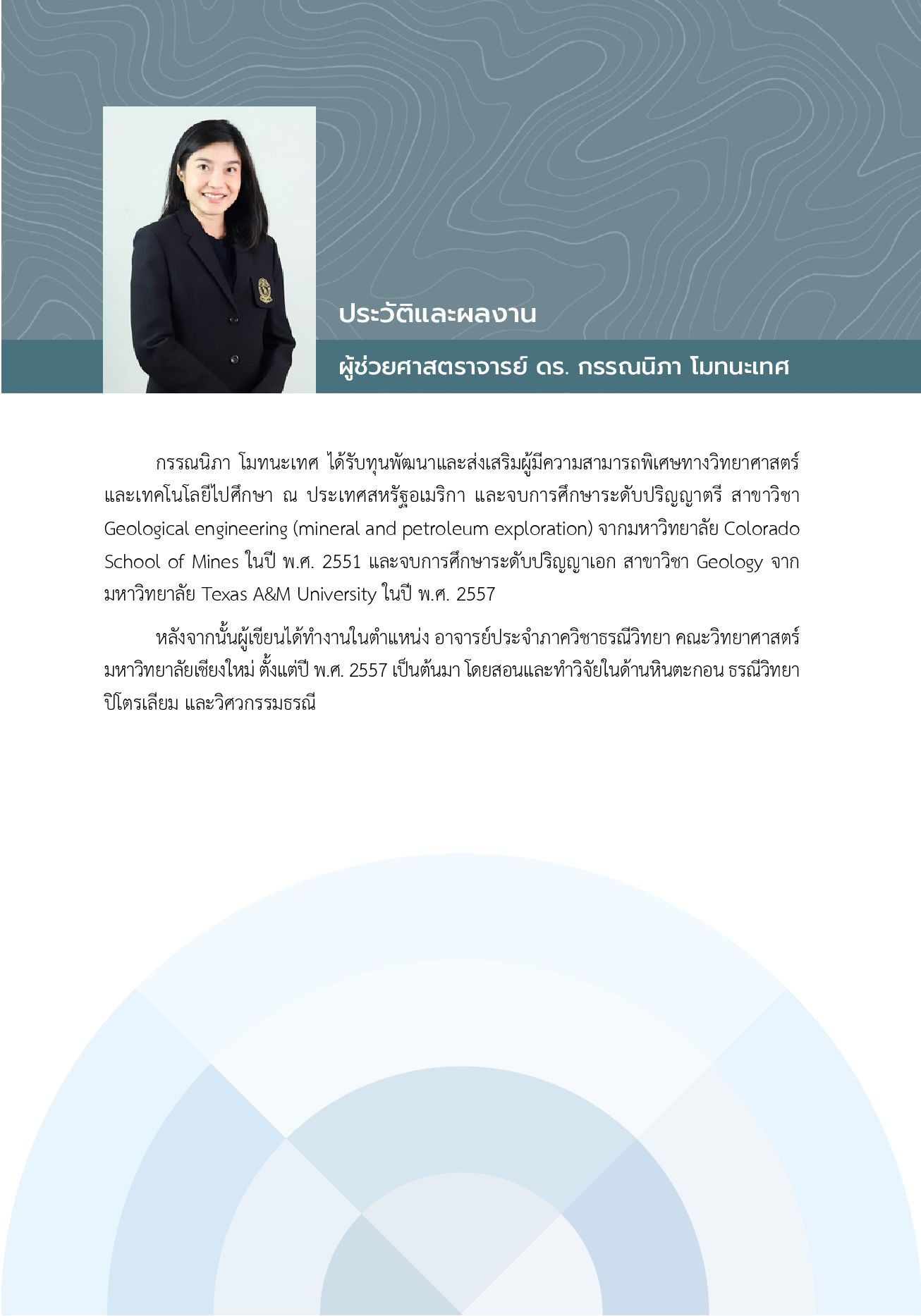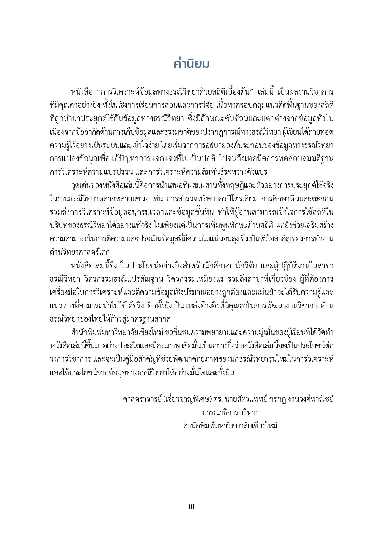หนังสือเล่มนี้ออกแบบมาเพื่อการเรียนรู้และยกระดับความสามารถด้านการวิเคราะห์ข้อมูลทางธรณีวิทยาโดยบูรณาการความรู้พื้นฐานทางสถิติเข้ากับการประยุกต์ใช้จริงอย่างเป็นระบบ โดยรวบรวมความรู้พื้นฐานด้านการวิเคราะห์ข้อมูลทางธรณีวิทยาด้วยเทคนิคทางสถิติอย่างเป็นลำดับขั้นตอน ครอบคลุมหลักการสถิติเบื้องต้น การแปลงข้อมูล การทดสอบทางสถิติ การวิเคราะห์ความสัมพันธ์ระหว่างตัวแปร ตลอดจนการเชื่อมโยงระหว่างทฤษฎีทางสถิติเข้ากับปัญหาในสาขาธรณีวิทยา หนังสือเล่มนี้เหมาะสำหรับ นักศึกษาธรณีวิทยา นักวิจัยและนักปฏิบัติงานด้านธรณีวิทยาที่ต้องการพัฒนาทักษะการวิเคราะห์ข้อมูลเชิงปริมาณเพื่อทำความเข้าใจและตีความข้อมูลทางธรณีวิทยาได้อย่างมีประสิทธิภาพ