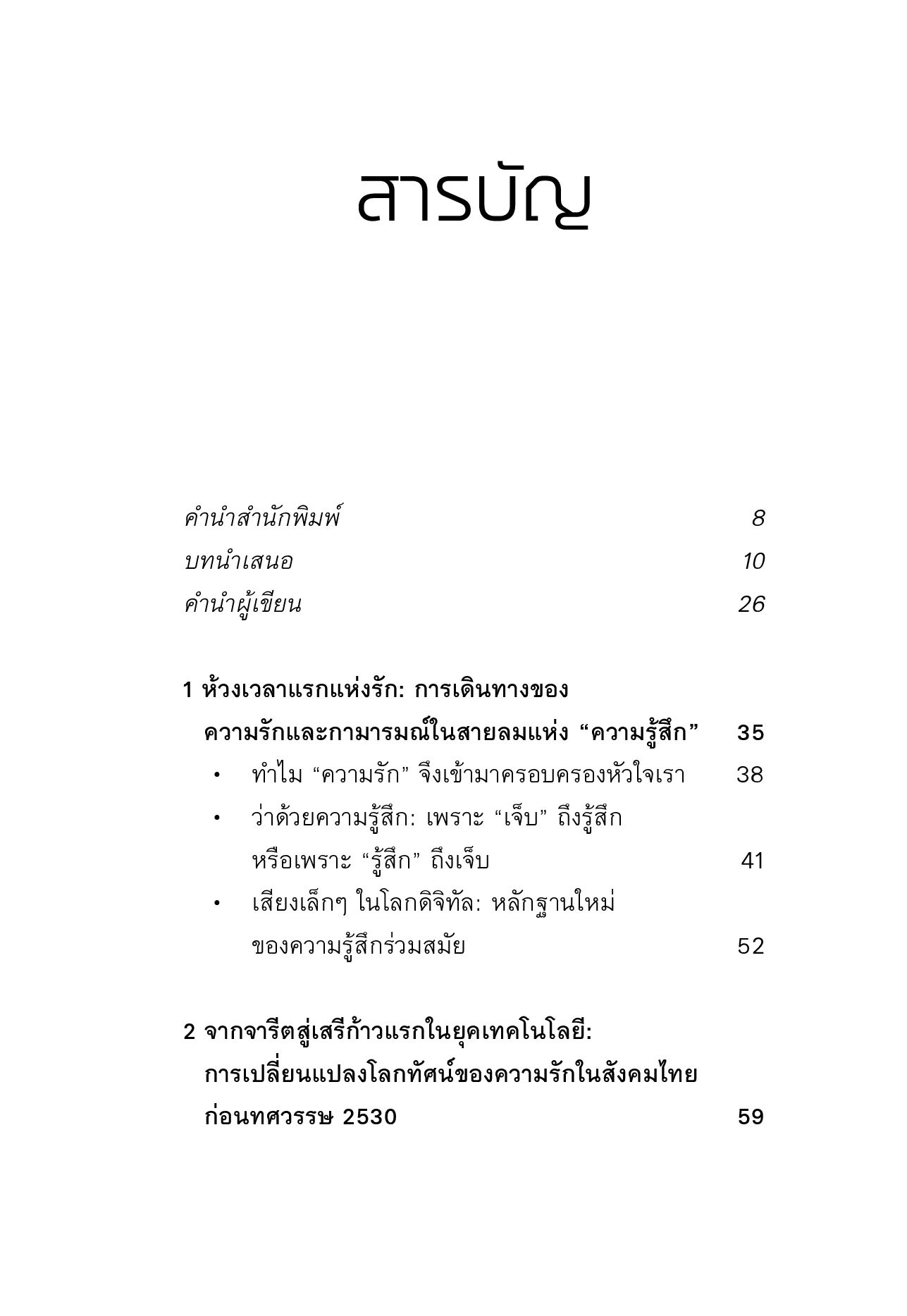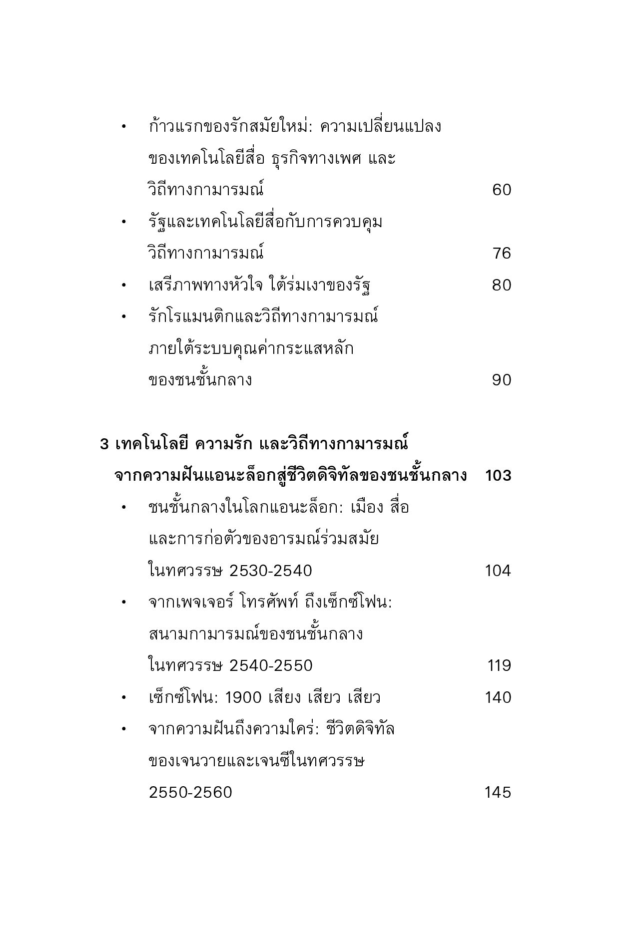 ว่าด้วยความสัมพันธ์ระหว่างความรักและวิถีกามารมณ์ในสังคมไทยที่มีลักษณะแปรเปลี่ยนไปตามเทคโนโลยี โดยเฉพาะกับความรักและวิถีกามารมณ์ของชนชั้นกลางไทยซึ่งรับอิทธิพลจากความเปลี่ยนแปลงนี้อย่างชัดเจน นับตั้งแต่ช่วงต้นยุครัตนโกสินทร์จวบจนก่อนทศวรรษ 2530 เทคโนโลยีสื่อต่างๆ มีบทบาทสำคัญในการหล่อหลอม “ความรัก” และ “กามารมณ์” ทว่าในทศวรรษ 2540-2560 ชนชั้นกลางแยกเรื่องความรักและความสัมพันธ์ทางเพศออกจากกันอย่างชัดเจน