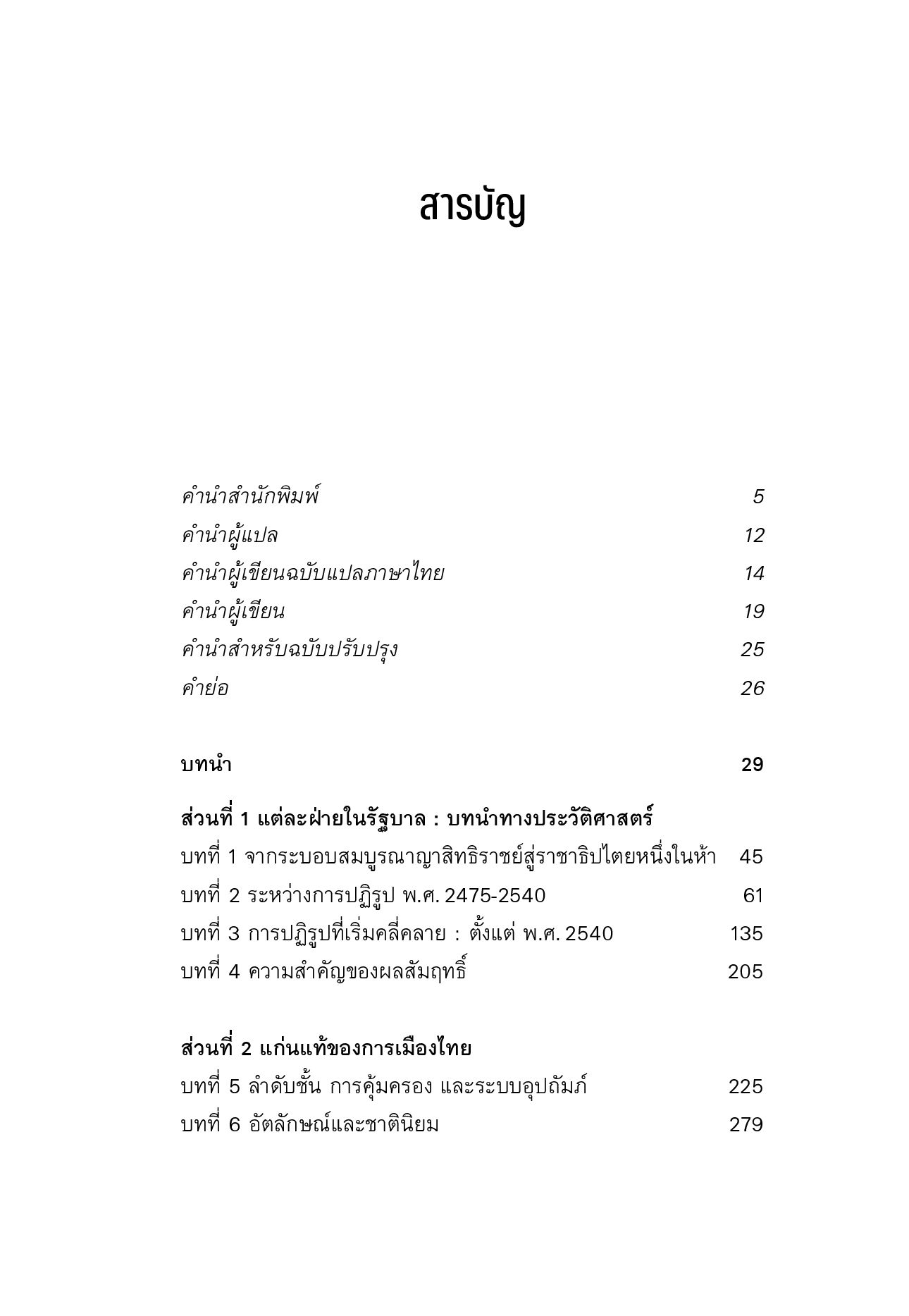 สำรวจการเมืองไทยร่วมสมัยจากสายตาทูตออสเตรเลีย ผ่านบริบททางประวัติศาสตร์ ระบบการเมือง และหลักนิติธรรมไทย ซึ่งชี้ให้เห็นความ “ไทยๆ” ที่แทรกซึมอยู่ในทุกมิติ โดยผู้เขียนพาเราย้อนอดีตกลับไปตั้งแต่การเปลี่ยนแปลงการปกครอง พ.ศ. 2475 จนถึงยุคร่วมสมัยหลัง พ.ศ. 2540 เพื่อให้เห็นความเป็นมาของการเมืองไทยที่ส่งผลต่อการเมืองปัจจุบัน โดยเชื่อมโยงกับอัตลักษณ์ แนวคิดชาตินิยม และหลักนิติธรรม ที่ทั้งหมดมีรากแนวคิดจากตะวันตก แต่บริบททางสังคม วัฒนธรรม ก็แปรเปลี่ยนให้กลายเป็นแบบ “ไทยๆ” จนเป็นลักษณะเฉพาะของการเมืองไทยในยุคปัจจุบัน