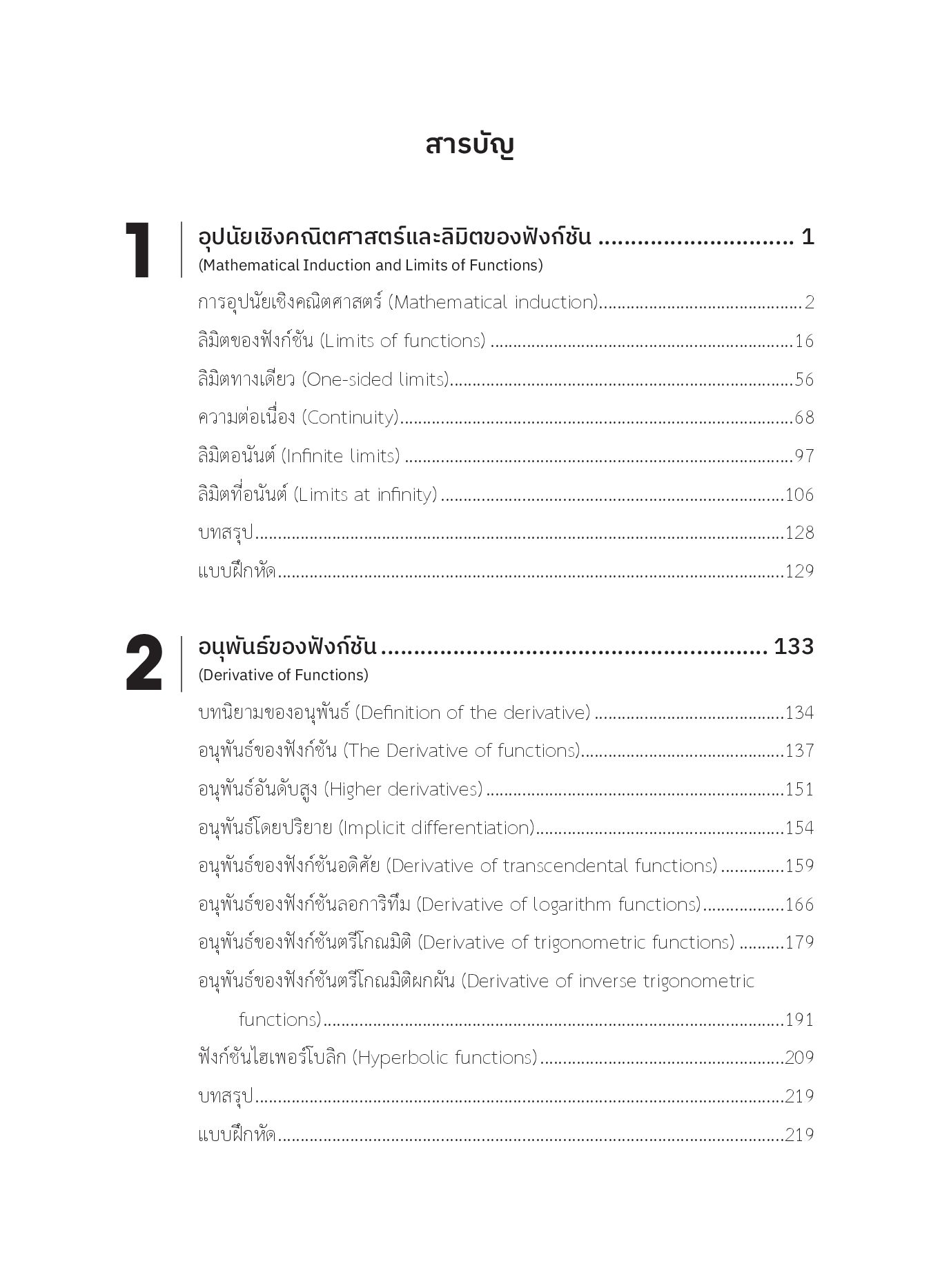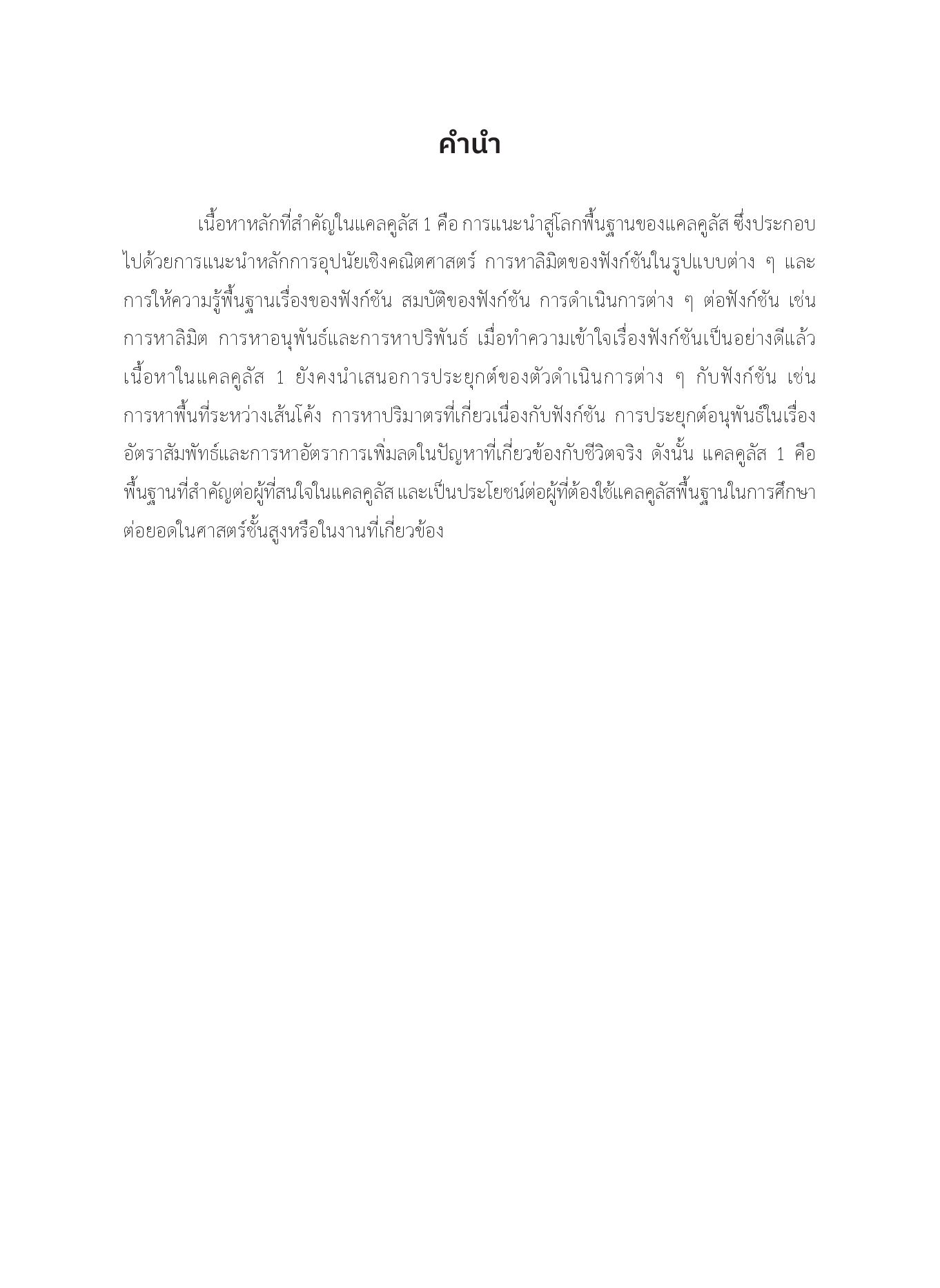 แคลคูลัสโดยทั่วไปแล้วประกอบด้วยเนื้อหา 3 ส่วน คือ แคลคูลัส 1 แคลคูลัส 2 และแคลคูลัส สำหรับหนังสือแคลคูลัส 1 เนื้อหาจะประกอบไปด้วย พื้นฐานการพิสูจน์ทางคณิตศาสตร์โดยใช้หลักการอุปนัย เชิงคณิตศาสตร์ การหาลิมิตของฟังก์ชัน การหาอนุพันธ์ของฟังก์ชันและการประยุกต์ การหาปริพันธ์ของฟังก์ชันและการประยุกต์ และเทคนิคในการหาปริพันธ์ เป็นต้น เนื้อหาในหนังสือเล่มนี้เป็นเนื้อหาของแคลคูลัสในส่วนแรก ซึ่งเป็นพื้นฐานที่สำคัญต่อการต่อยอด ในแคลคูลัสระดับสูง ดังนั้น หนังสือเล่มนี้จึงนำเสนอตัวอย่าง บทนิยาม และทฤษฎีบทอย่างละเอียดและง่ายต่อการเข้าใจในทุกขั้นตอน มีการแทรกความรู้พื้นฐานต่าง ๆ ทางคณิตศาสตร์ที่จำเป็น เพื่อทำให้การแก้ปัญหาบรรลุสู่เป้าหมาย เหมาะสมกับทุกคนที่ต้องใช้ความรู้พื้นฐานทางแคลคูลัสในการเรียนการสอน ประกอบอาชีพ หรือเสริมความรู้เพิ่มเติม