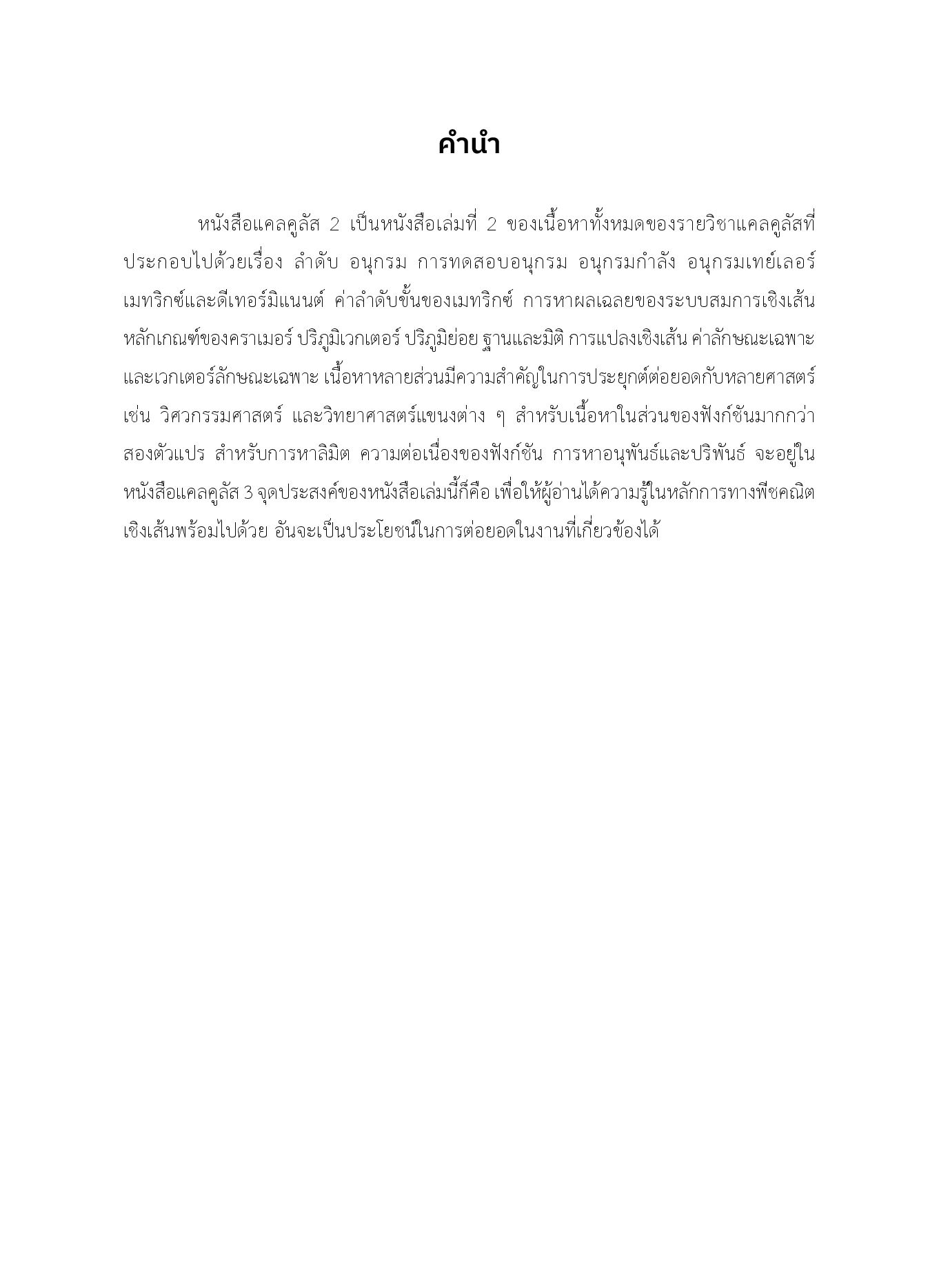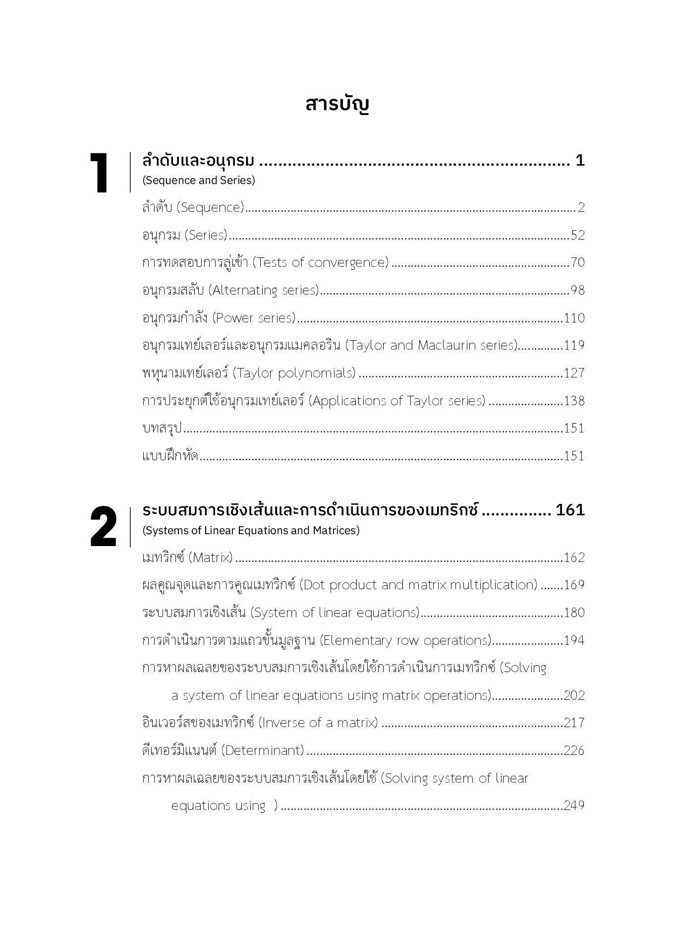 แคลคูลัสโดยทั่วไปแบ่งออกเป็น 3 ส่วนหลัก ได้แก่ แคลคูลัส 1 แคลคูลัส 2 และแคลคูลัส 3 ซึ่งมีเนื้อหาที่ค่อยๆ เพิ่มความซับซ้อนและครอบคลุมแนวคิดที่สำคัญในคณิตศาสตร์ระดับสูง แคลคูลัส 1 (Calculus I) ครอบคลุมพื้นฐานการพิสูจน์ทางคณิตศาสตร์ เช่น การใช้อุปนัยเชิงคณิตศาสตร์ การหาลิมิตและอนุพันธ์ของฟังก์ชัน รวมถึงการประยุกต์ใช้และเทคนิคในการหาปริพันธ์ เนื้อหาในส่วนนี้เป็นรากฐานสำคัญที่นักเรียนควรเข้าใจก่อนจะต่อยอดไปสู่เนื้อหาในระดับสูงกว่า แคลคูลัส 2 (Calculus II) เน้นเพิ่มเติมพีชคณิตเชิงเส้นและความเข้าใจเกี่ยวกับลำดับและอนุกรม มีการตรวจสอบความลู่เข้าของลำดับและอนุกรมโดยใช้เทคนิคต่าง ๆ เช่น การใช้ลิมิต ปริพันธ์ และอัตราส่วน ส่วนสำคัญยังรวมถึงการใช้เมทริกซ์ในการหาผลเฉลยของระบบสมการเชิงเส้น รวมถึงเนื้อหาที่เกี่ยวกับปริภูมิเวกเตอร์ แคลคูลัส 3 (Calculus III) เน้นการหาผลเฉลยของสมการเชิงอนุพันธ์เชิงเส้น การแปลงลาปลาซและลาปลาซผกผัน นอกจากนี้ยังมีเนื้อหาเกี่ยวกับการหาอนุพันธ์และปริพันธ์ของฟังก์ชันหลายตัวแปร รวมถึงแคลคูลัสของเวกเตอร์ เช่น ทฤษฎีบทของเกาส์และสโตกส์ ซึ่งเหมาะสำหรับผู้ที่ต้องการศึกษาในเชิงลึก แต่ละส่วนของแคลคูลัสจะมีบทนิยาม ทฤษฎี และตัวอย่างอย่างละเอียดเพื่อช่วยให้ผู้เรียนสามารถเข้าใจและนำไปประยุกต์ใช้ได้
