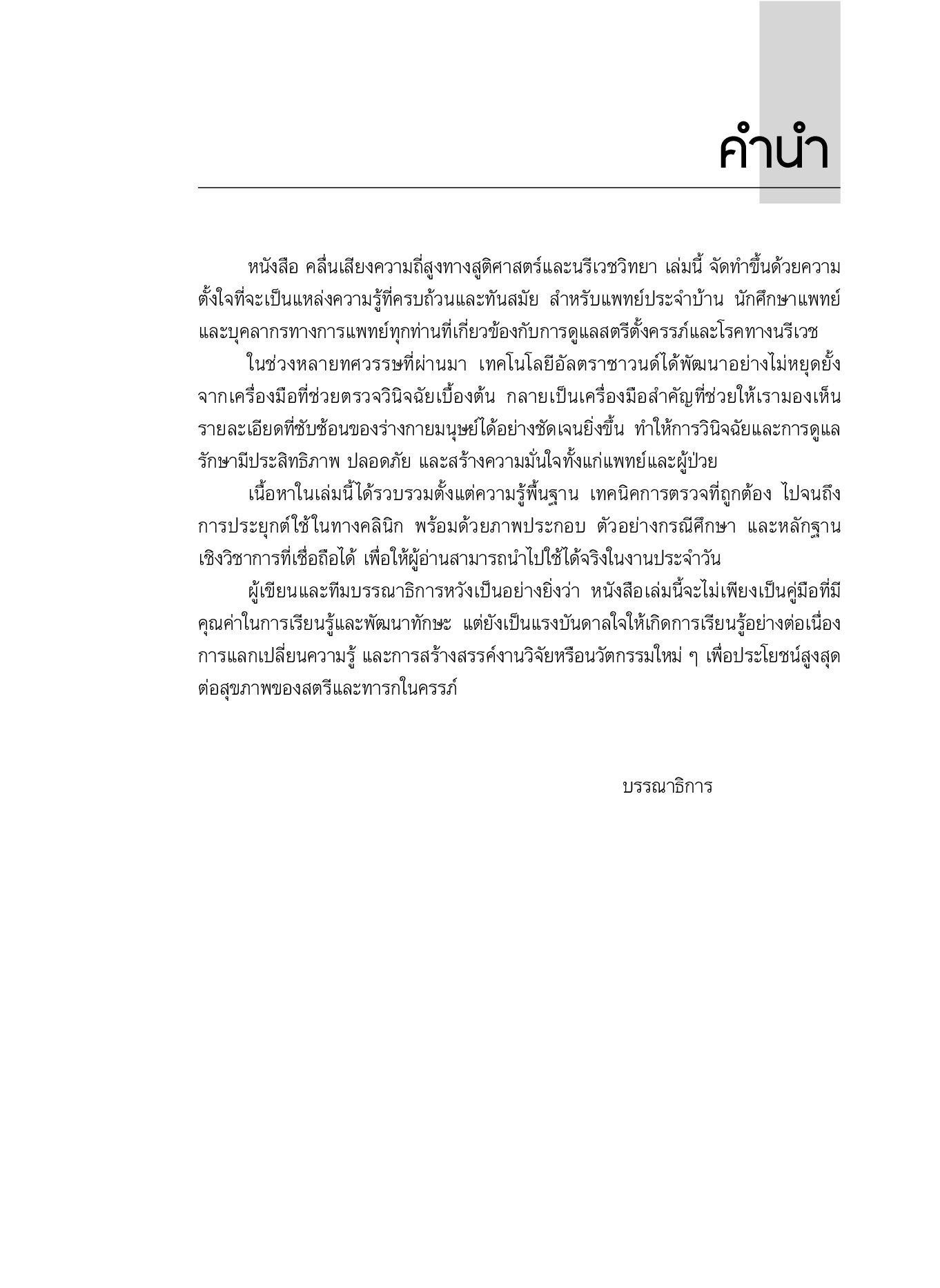 หนังสือ "คลื่นเสียงความถี่สูงทางสูติศาสถร์และนรีเวชวิกยา" เล่มนี้ เป็นฉบับเรียบเรียงครั้งที่ 3 ได้ทำการปรับปรุง เนื้อหาที่เกี่ยวข้องให้มีความกันสมัยและครอบคลุม รวมถึงไถ้รวบรวมภาพตัวอย่างการถรวจคลื่นเสียงความถี่สูงไว้มากมาย ซึ่งผู้ประพันธ์หวังว่าจะเป็นประโยชน์แก่ผู้อำนในการดูแลผู้ใวยต่อไป