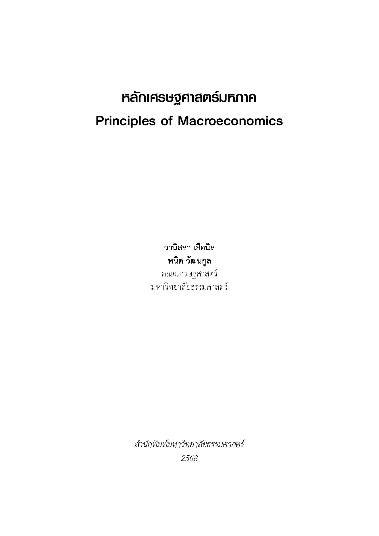 ตำรา "หลักเศรษฐศาสตร์มหภาค" เล่มนี้ จัดทำขึ้นเพื่อปูพื้นฐานให้แก่ผู้เริ่มต้นศึกษาเศรษฐศาสตร์มหภาค โดยครอบคลุมแนวคิดหลัก กลไกสำคัญและแบบจำลองที่ใช้วิเคราะห์ระบบเศรษฐกิจ ตั้งแต่การวัดผลผลิตมวลรวมของประเทศ ไปจนถึงบทบาทของนโยบายการเงินและการคลังในการแก้ไขปัญหาเศรษฐกิจ ทั้งในระบบเศรษฐกิจปิดและเศรษฐกิจเปิด เนื้อหาถูกเรียบเรียงอย่างเป็นระบบ พร้อมหัวข้อเสริม POLICY PERSPECTIVES, EMPIRICAL EVIDENCE, CASE STUDY และ DATA INSIGHT ที่ช่วยเชื่อมโยงทฤษฎีกับสถานการณ์จริง เหมาะสำหรับผู้ที่ต้องการเข้าใจภาพรวมเศรษฐกิจอย่างมีหลักการ และพัฒนาทักษะวิเคราะห์เชิงประยุกต์เพื่อใช้ต่อยอดในการเรียนรู้และการมองเศรษฐกิจในชีวิตจริงอย่างมีวิจารณญาณ