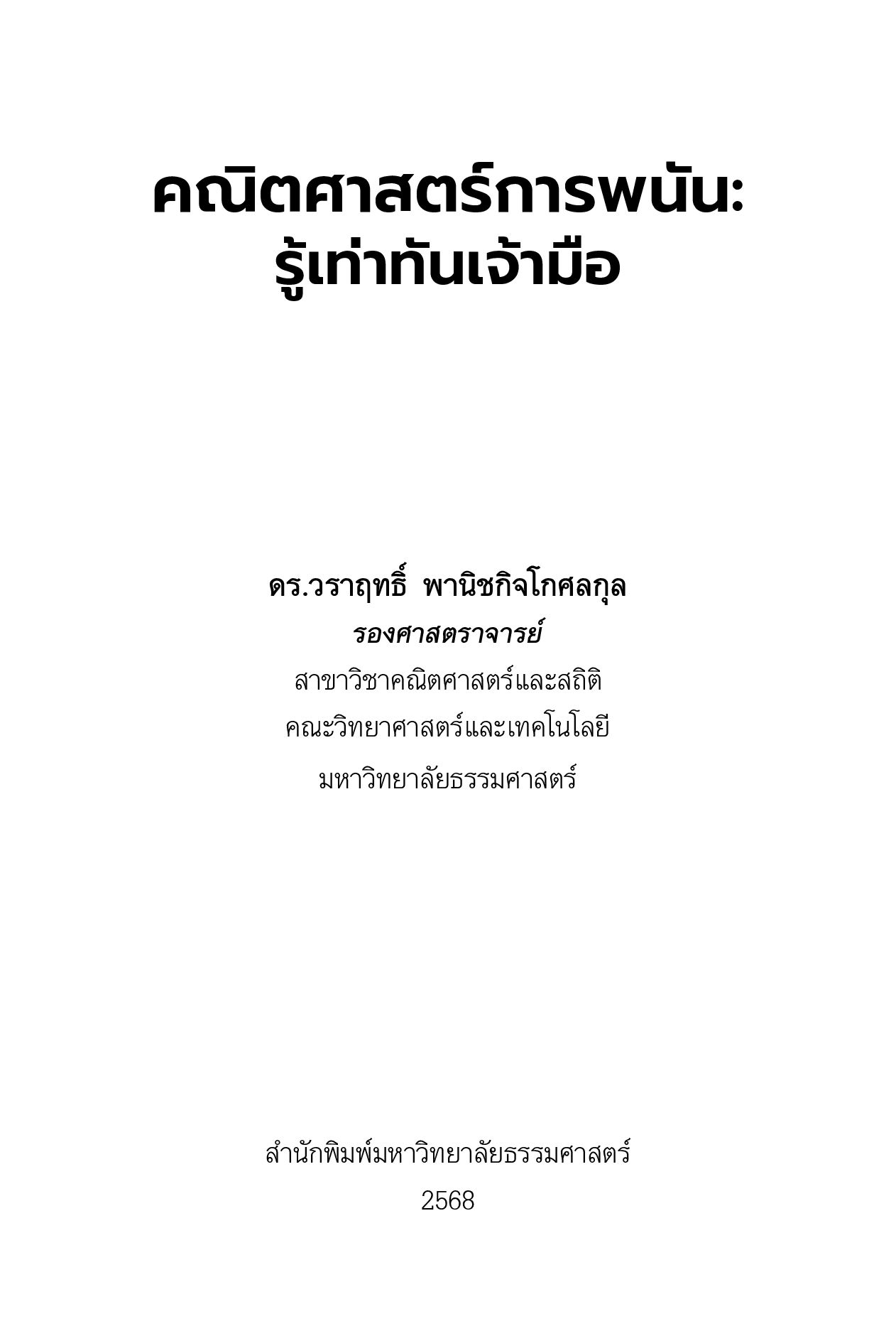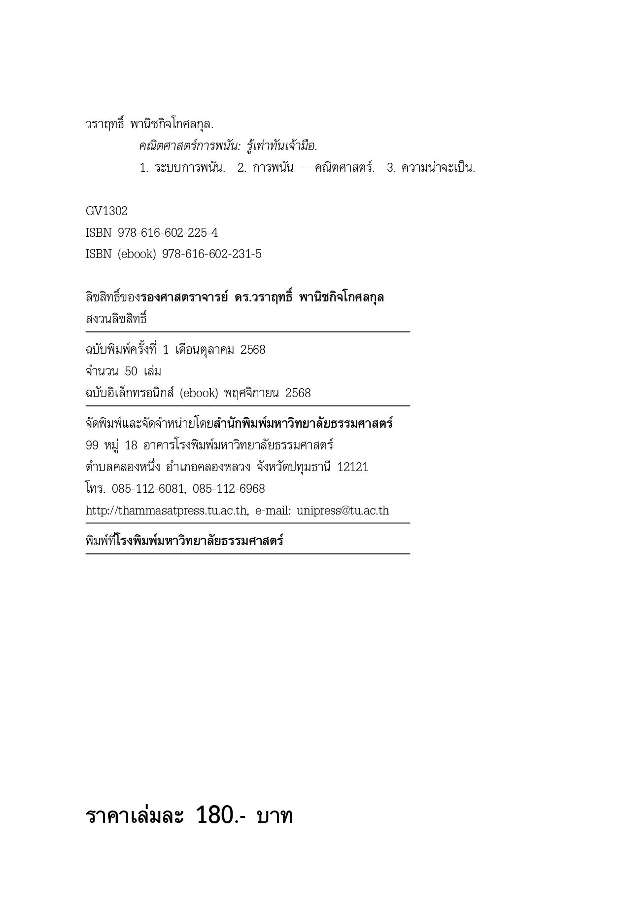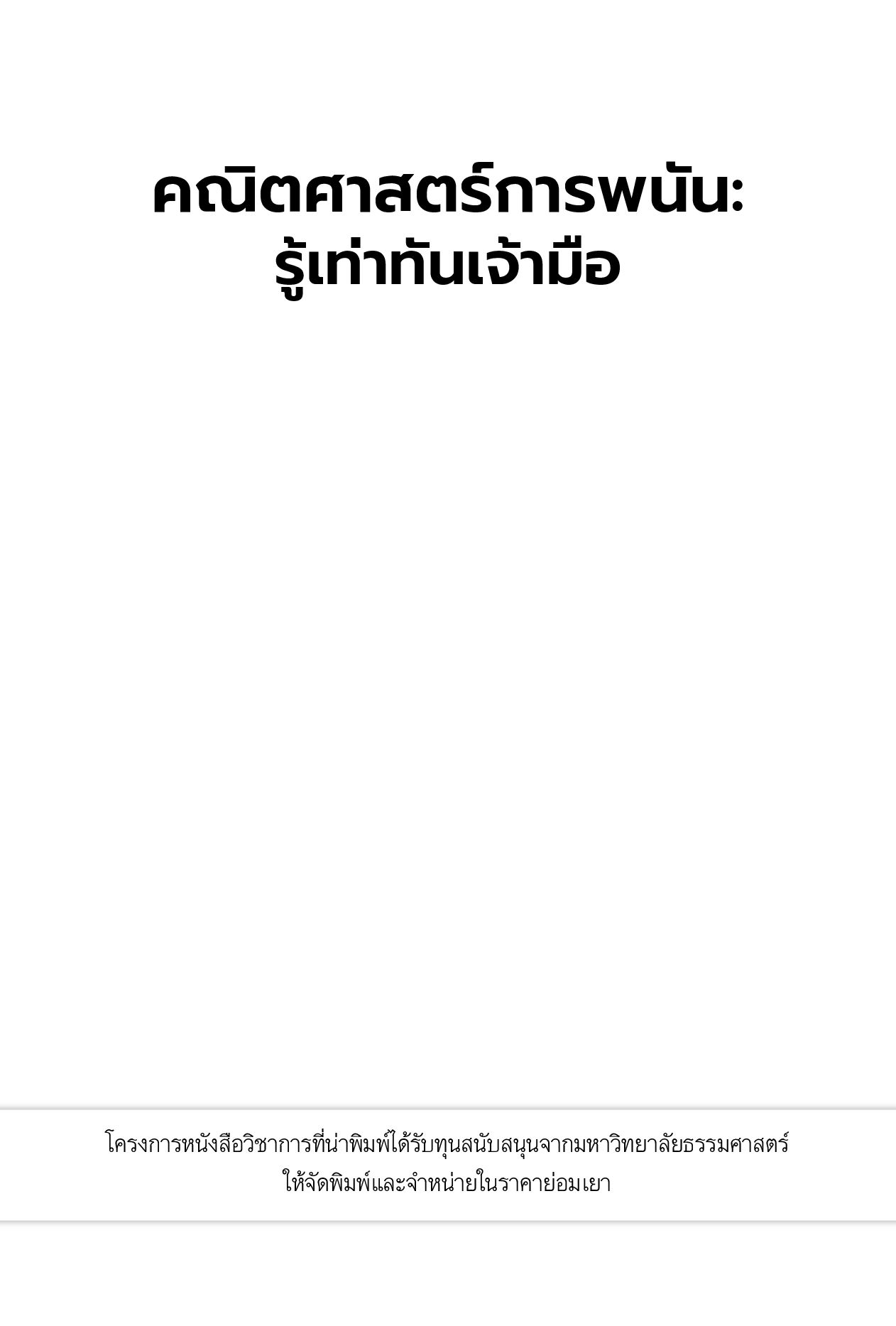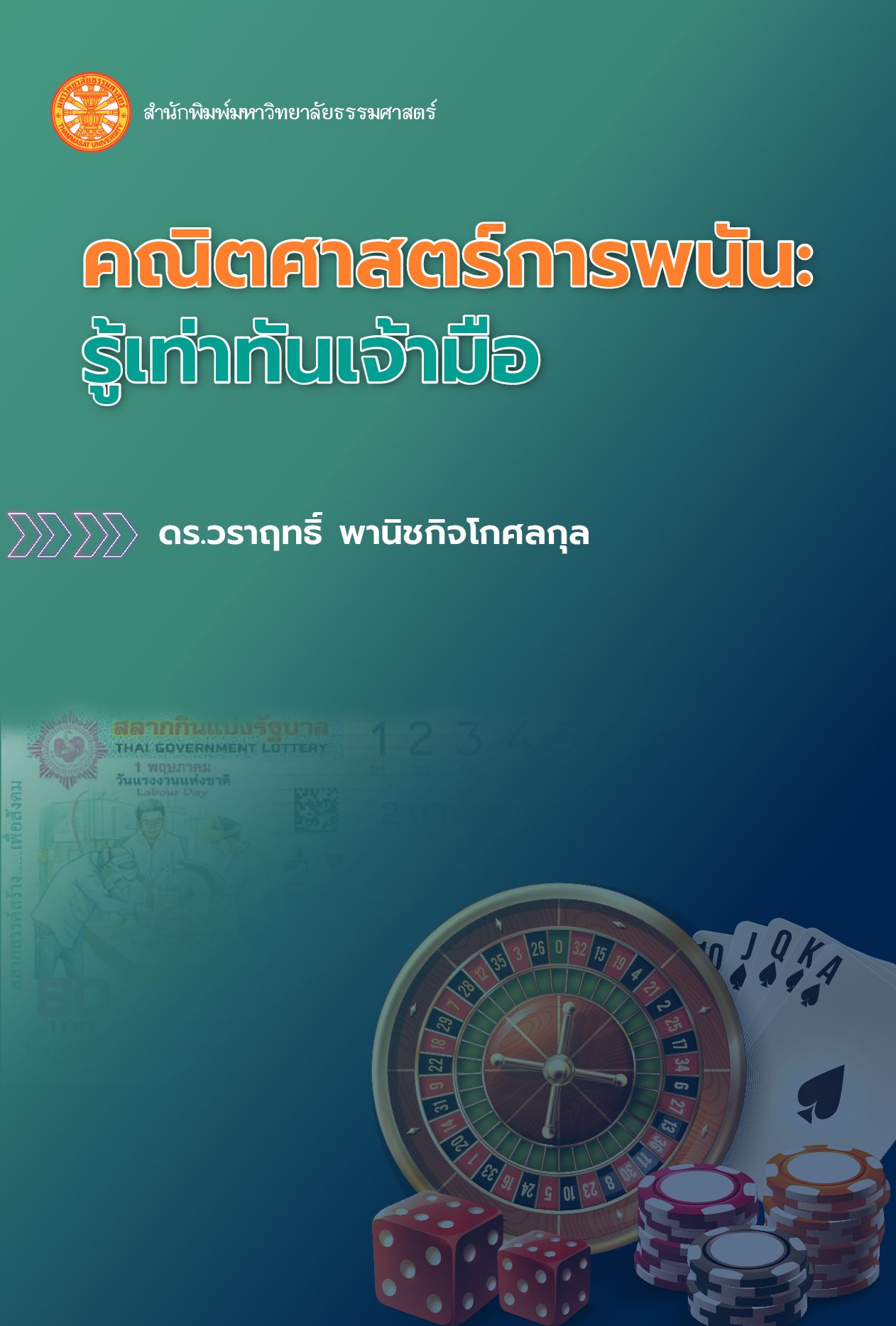 คณิตศาสตร์การพนัน : รู้เท่าทันเจ้ามือ "รู้หรือไม่ว่าการพนันที่ดูเหมือนแค่เกมเสี่ยงโชค ซ่อนกลยุทธ์ทางคณิตศาสตร์ไว้อย่างแยบยล? หนังสือเล่มนี้จะพาคุณก้าวข้ามความไม่รู้ สู่ความเข้าใจเรื่องความน่าจะเป็นและผลตอบแทนที่แท้จริงของเกมเสี่ยงโชคยอดนิยม ตั้งแต่สลากกินแบ่งรัฐบาล หวยใต้ดิน หวยพัฒนนา ไฮโล รูเล็ต ไปจนถึงบาคาร่า ด้วยข้อมูลที่กลั่นกรองจากงานวิจัยและการวิเคราะห์เชิงสถิติ "คณิตศาสตร์การพนัน: รู้เท่าทันเจ้ามือ" จะช่วยให้คุณรู้เท่าทันกลไกของเจ้ามือ หลีกเลี่ยงการตกเป็นเหยื่อและมองเกมเหล่านี้ด้วยสายตาที่เฉียบคมกว่าเดิมไม่ว่าคุณจะเป็นนักคณิตศาสตร์ หรือผู้สนใจทั่วไป หนังสือเล่มนี้จะช่วยเปิดมุมมองใหม่และสร้างความเข้าใจที่ถูกต้องเกี่ยวกับ "ความเสี่ยง" และ "ผลตอบแทน" ของเกมพนันต่าง ๆ"