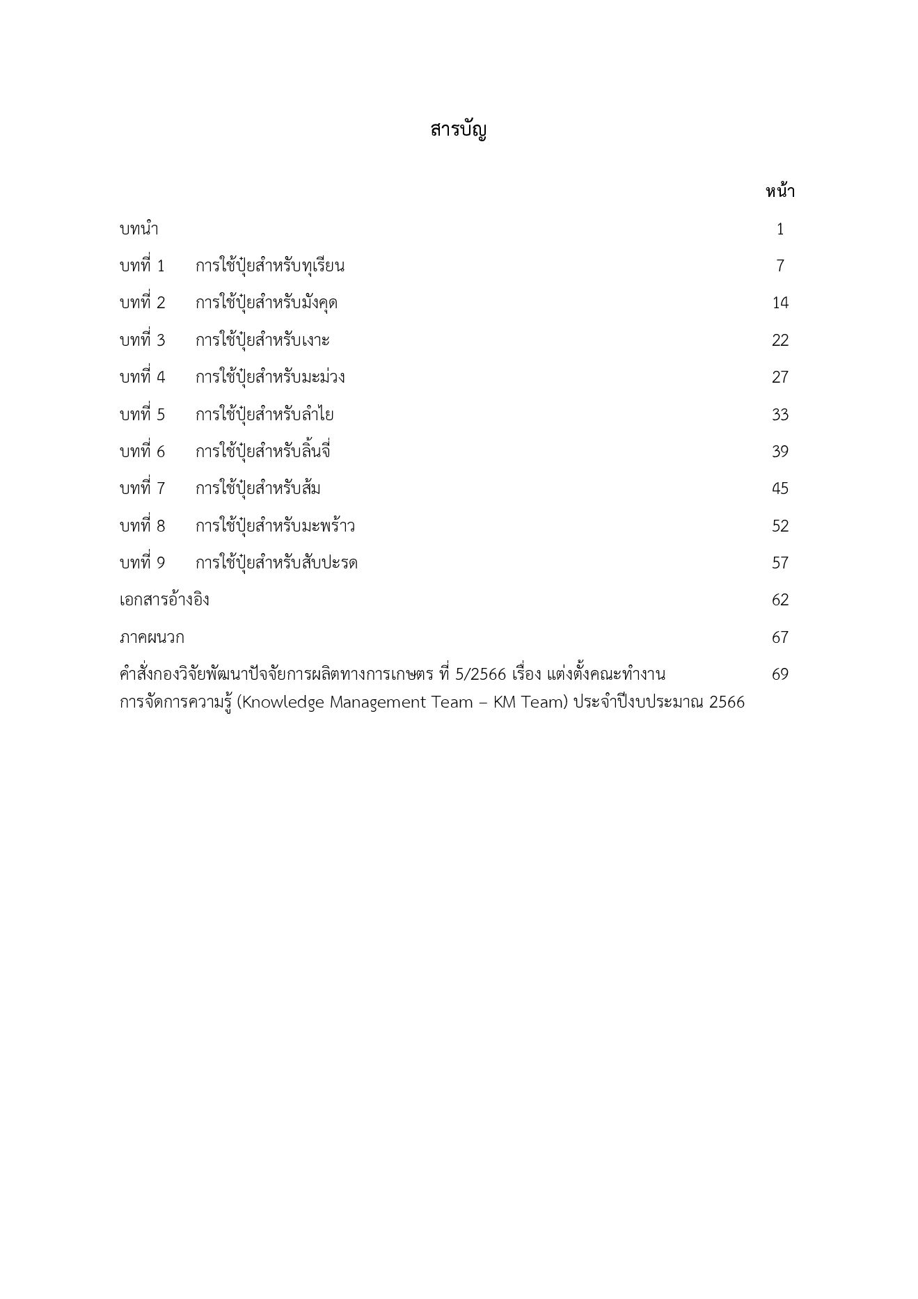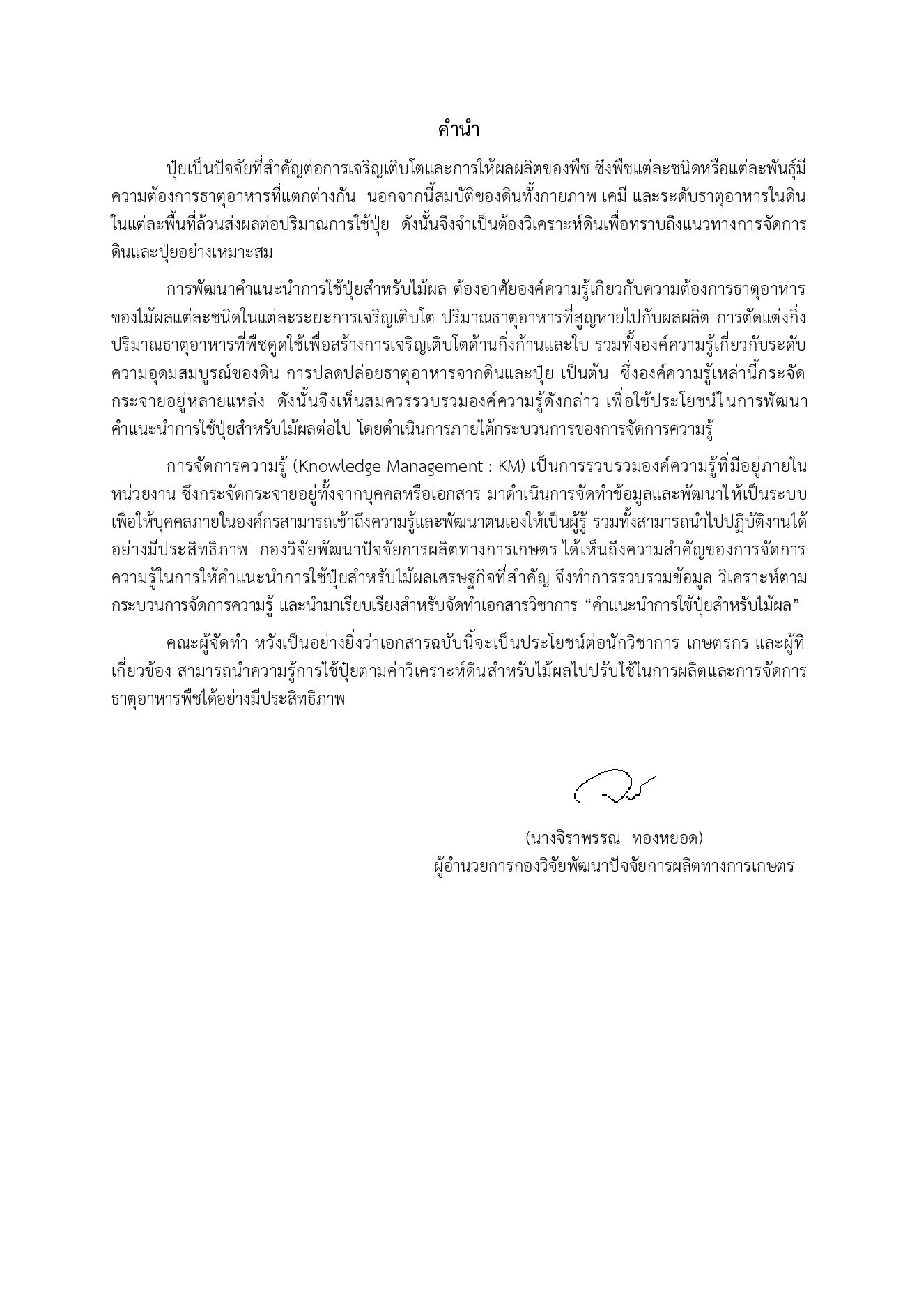 การพัฒนาคําแนะนําการใช้ปุ๋ยสําหรับไม้ผล ต้องอาศัยองค์ความรู้เกี่ยวกับความต้องการธาตุอาหาร ของไม้ผลแต่ละชนิดในแต่ละระยะการเจริญเติบโต ปริมาณธาตุอาหารที่สูญหายไปกับผลผลิต การตัดแต่งกิ่ง ปริมาณธาตุอาหารที่พืชดูดใช้เพื่อสร้างการเจริญเติบโตด้านกิ่งก้านและใบ รวมทั้งองค์ความรู้เกี่ยวกับระดับ ความอุดมสมบูรณ์ของดิน การปลดปล่อยธาตุอาหารจากดินและปุ๋ย เป็นต้น ซึ่งองค์ความรู้เหล่านี้กระจัด กระจายอยู่หลายแหล่ง ดังนั้นจึงเห็นสมควรรวบรวมองค์ความรู้ดังกล่าว เพื่อใช้ประโยชน์ในการพัฒนา คําแนะนําการใช้ปุ๋ยสําหรับไม้ผลต่อไป โดยดําเนินการภายใต้กระบวนการของการจัดการความรู้
