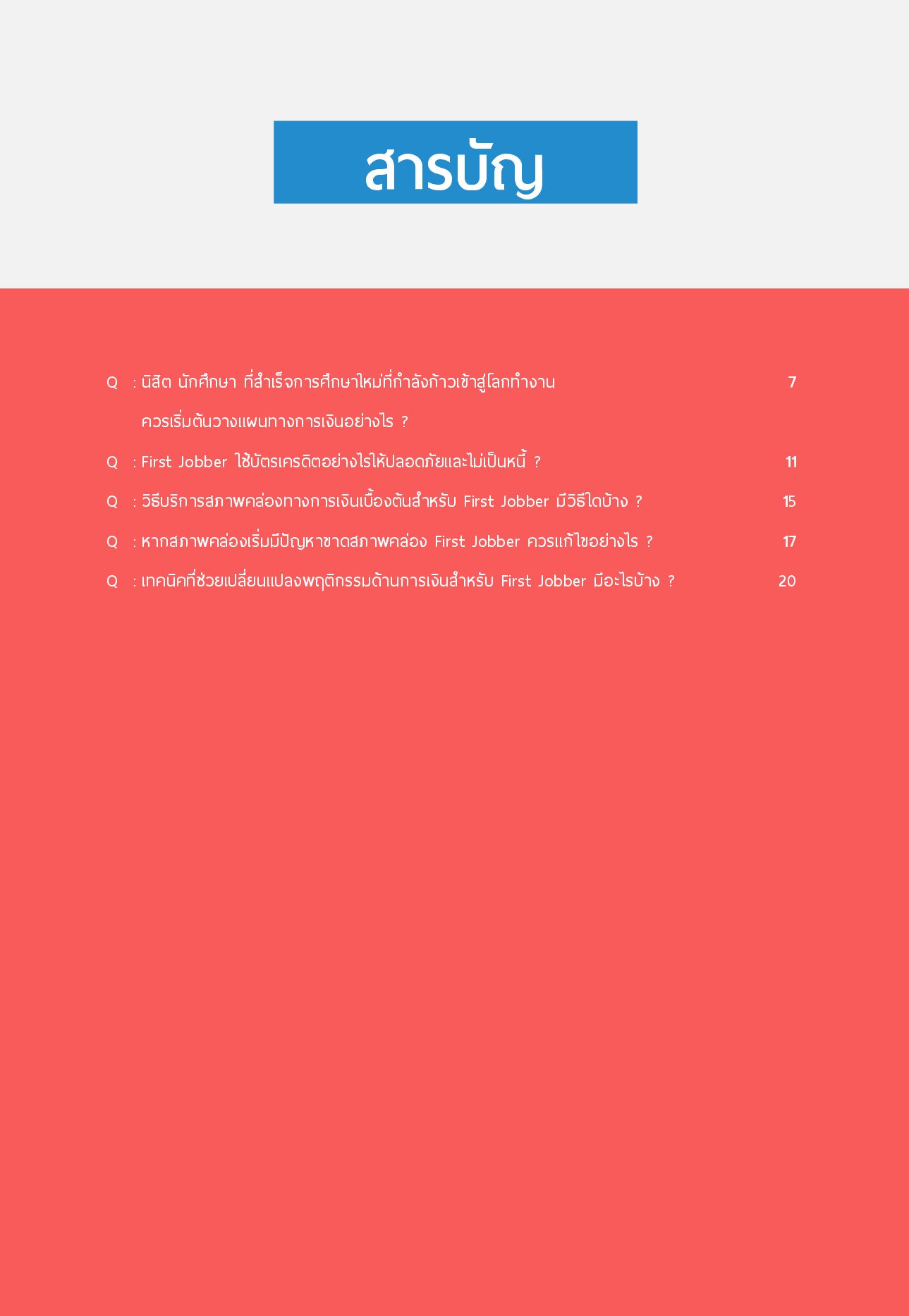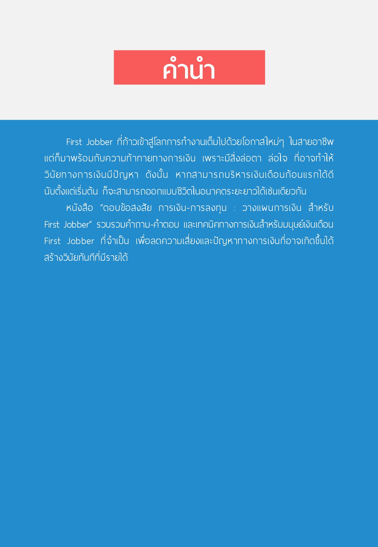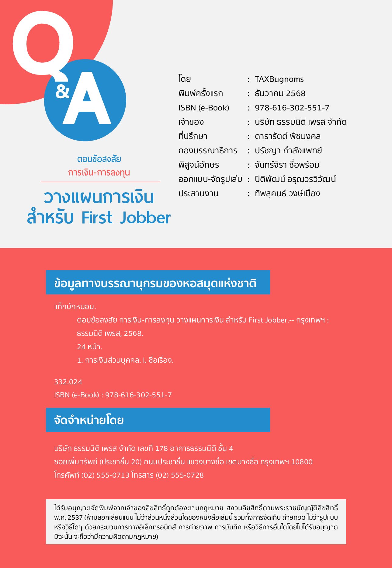 หากคุณเป็นคนหนึ่งที่เป็น First Jobber หนังสือเล่มนี้รวบรวมคำถาม-คำตอบ ที่จำเป็นสำหรับการสร้างวินัยทางการเงินที่มั่นคงในอนาคต เทคนิคการบริหารสภาพคล่องที่จะช่วยให้ รวมถึงวิธีใช้บัตรเครดิตอย่างปลอดภัยและไม่เป็นหนี้ ลดความเสี่ยงจากปัญหาหนี้สิน เริ่มต้นดีเพื่ออนาคตของตัวคุณ!