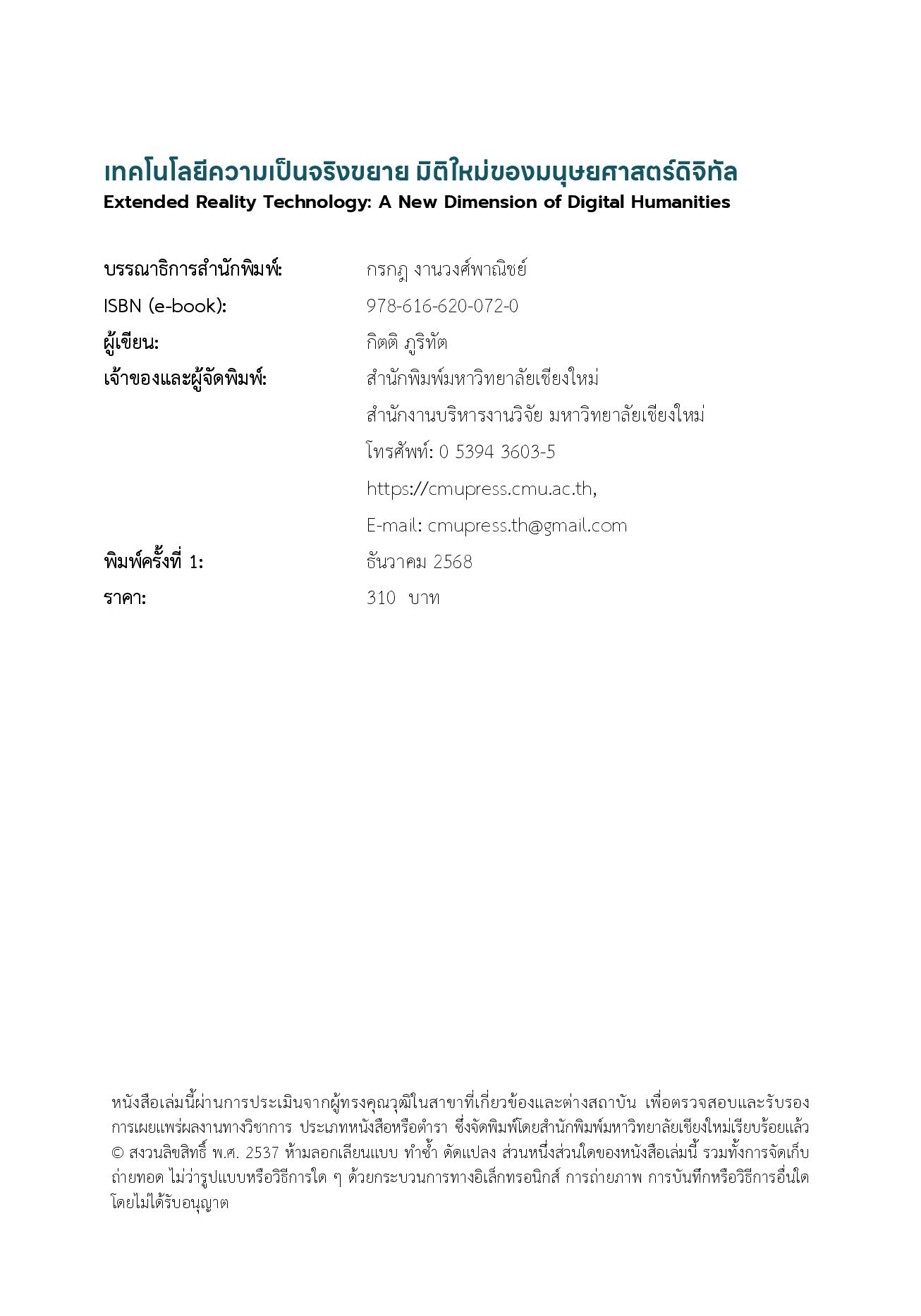 นำเสนอการบูรณาการองค์ความรู้ด้านเทคโนโลยีความเป็นจริงขยาย ครอบคลุมทั้งความเป็นจริงเสริมความเป็นจริงเสมือนและความเป็นจริงผสมเข้ากับศาสตร์ด้านมนุษยศาสตร์และวัฒนธรรมเพื่อเปิดมิติใหม่ของ "มนุษยศาสตร์ดิจิทัล"ที่เชื่อมโยงการเรียนรู้เชิงทฤษฎีกับประสบการณ์เชิงปฏิสัมพันธ์ในโลกเสมือนจริงอย่างมีความหมายเนื้อหาประกอบด้วยแนวคิดพื้นฐาน ทฤษฎีสำคัญ รวมถึงกรณีศึกษาที่ถ่ายทอดกระบวนการประยุกต์ใช้เทคโนโลยีอย่างเป็นรูปธรรม