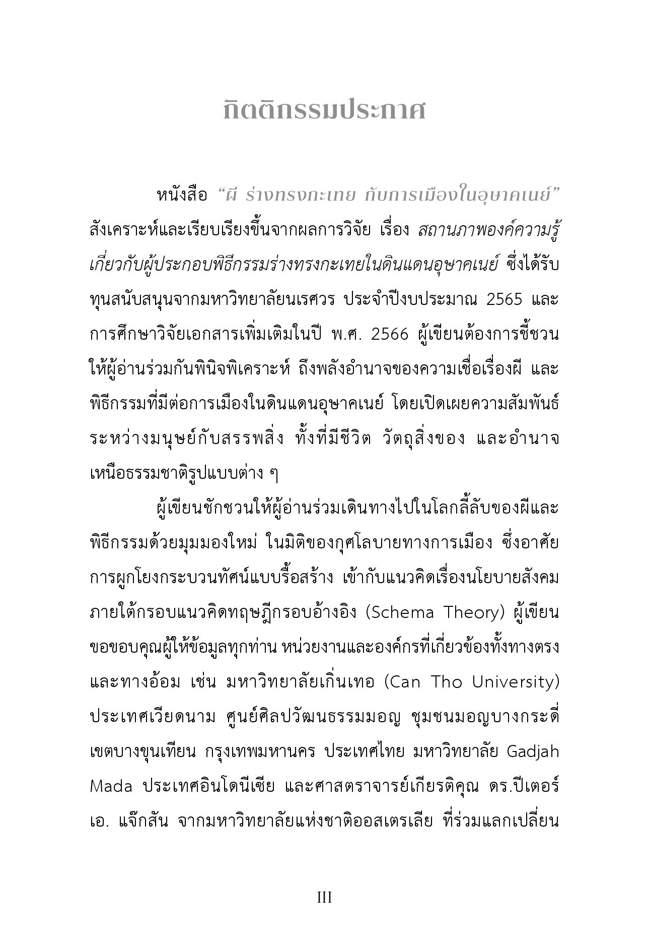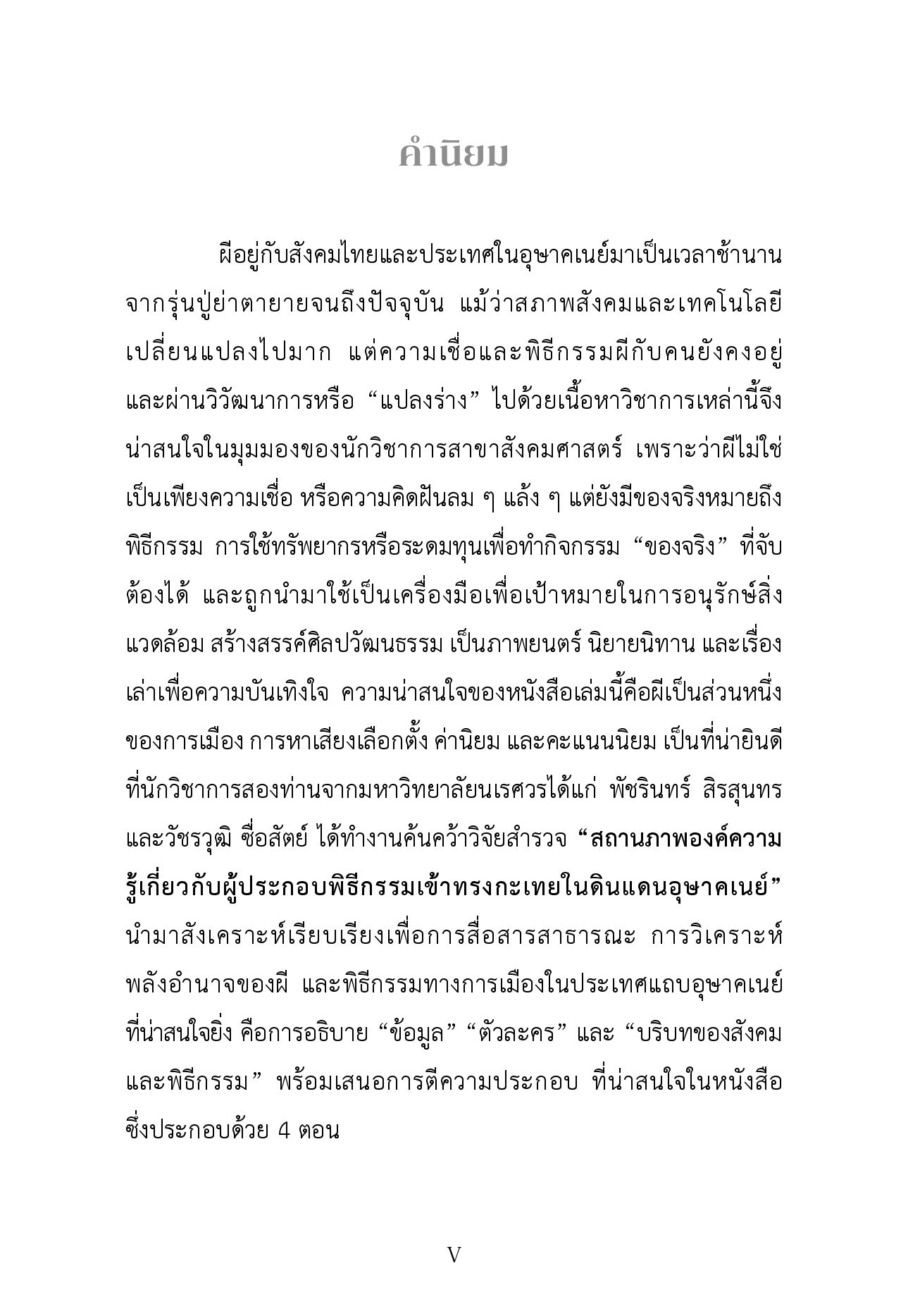 หนังสือ “ผี ร่างทรงกะเทย กับการเมืองในอุษาคเนย์” เปิดเผยชุดของความจริงในระดับญาณวิทยา ที่สะท้อนให้เห็นถึงที่มาของความรู้ความจริงแบบอื่น ทั้งเรื่องชุมชนในความหมายและบทบาทใหม่ที่มีสภาพเลื่อนไหลไร้พรมแดน ที่เกิดจากความสัมพันธ์ระหว่างมนุษย์และสิ่งที่ไม่ใช่มนุษย์ โดยมีผี ร่างทรงกะเทยเป็นผู้แสดงสำคัญที่เปิดเผยปัญหา ความหวัง และความต้องการของผู้คนในดินแดนอุษาคเนย์ ในขณะที่สามัญชนใช้การเปล่งเสียงผ่านบทสวด คำอธิษฐาน การฟ้อนรำ และวัตถุวัฒนธรรมที่ใช้เซ่นไหว้บวงสรวง ผู้ปกครองใช้ร่างทรง และพิธีกรรมเป็นกุศโลบายทางการเมืองเพื่อควบคุมจัดการพลเมืองของตน
