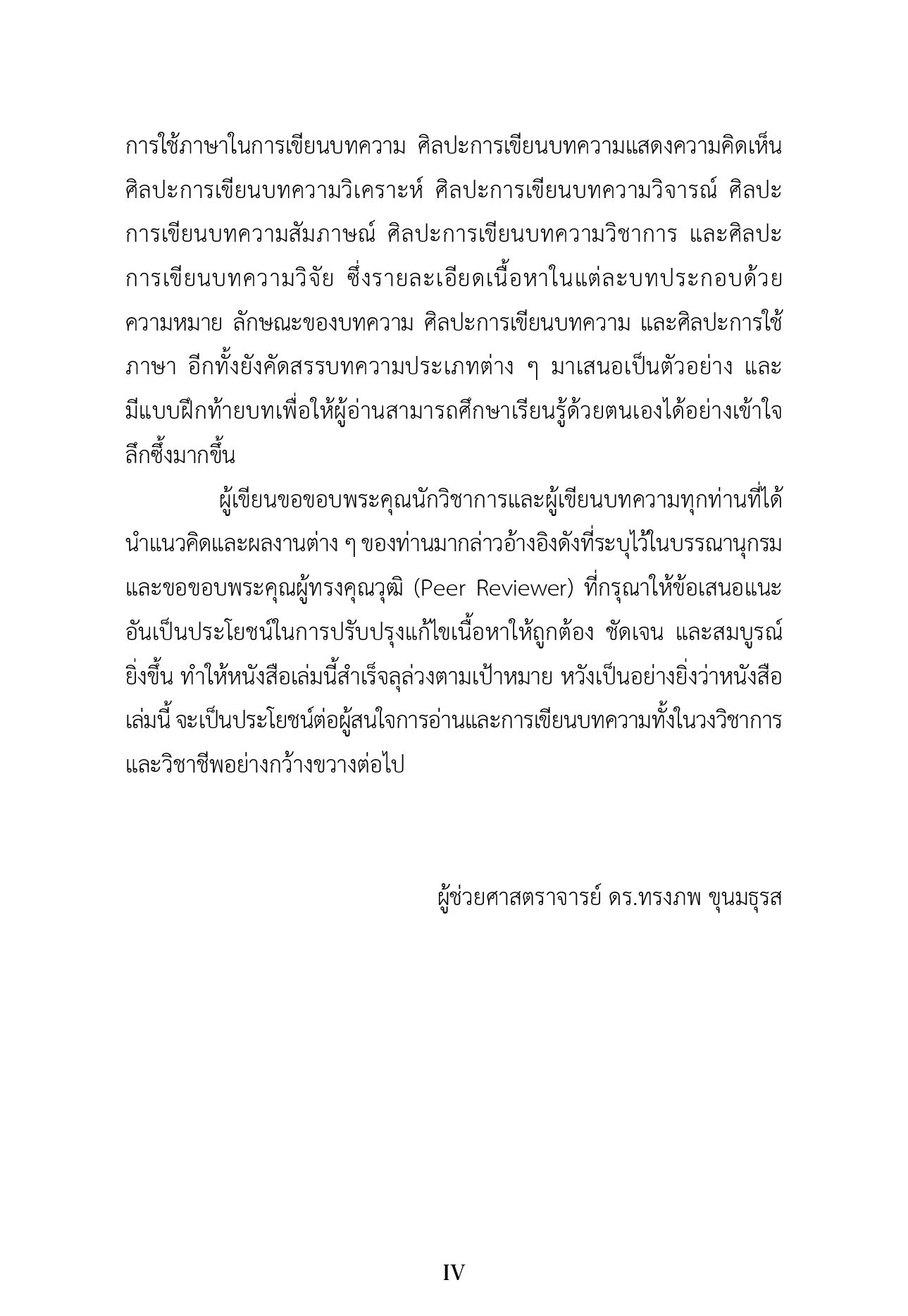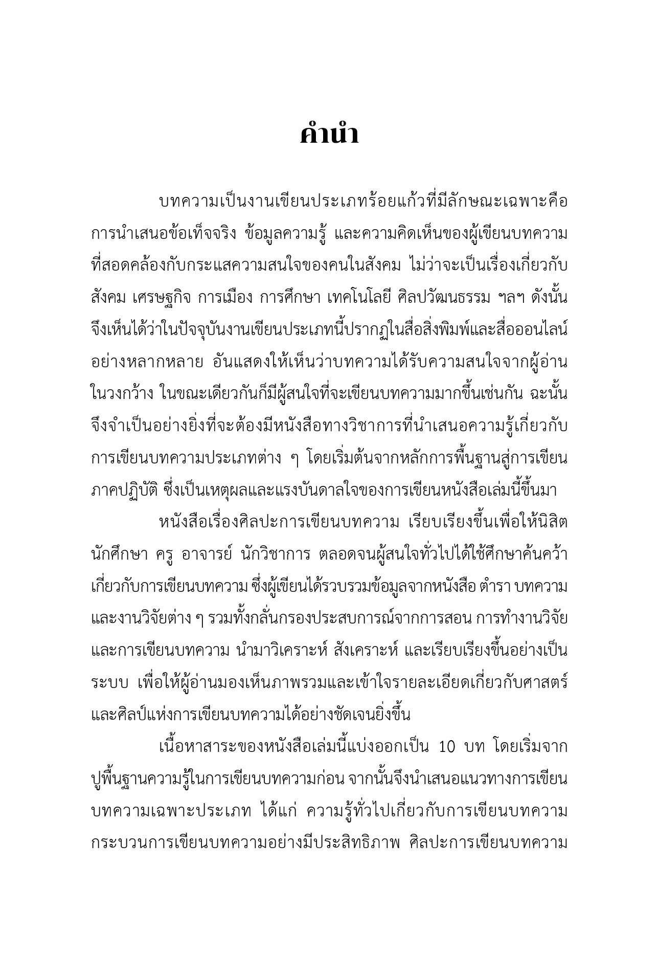 หนังสือ ศิลปะการเขียนบทความ ลำดับเนื้อหาจากง่าย ไปหายาก โดยเริ่มจากปูพื้นฐานความรู้ว่าด้วยการเขียนบทความใน ภาพกว้างก่อน จากนั้นจึงนำเสนอแนวทางการเขียนบทความเฉพาะประเภท อีกทั้งยังคัดสรรบทความประเภทต่าง ๆ มาเสนอเป็นตัวอย่างเพื่อให้ผู้อ่านสามารถศึกษาเรียนรู้ด้วยตนเองได้อย่างเข้าใจลึกซึ้ง หนังสือเล่มนี้เหมาะสำหรับนิสิต นักศึกษา ครู อาจารย์ นักวิชาการ ตลอดจนผู้สนใจศึกษาค้นคว้าเกี่ยวกับการเขียนบทความ ซึ่งจะเป็นคู่มือช่วยให้ผู้อ่านมองเห็นภาพรวมและเข้าใจรายละเอียดเกี่ยวกับศาสตร์และศิลป์แห่งการเขียนบทความได้อย่างชัดเจนยิ่งขึ้น