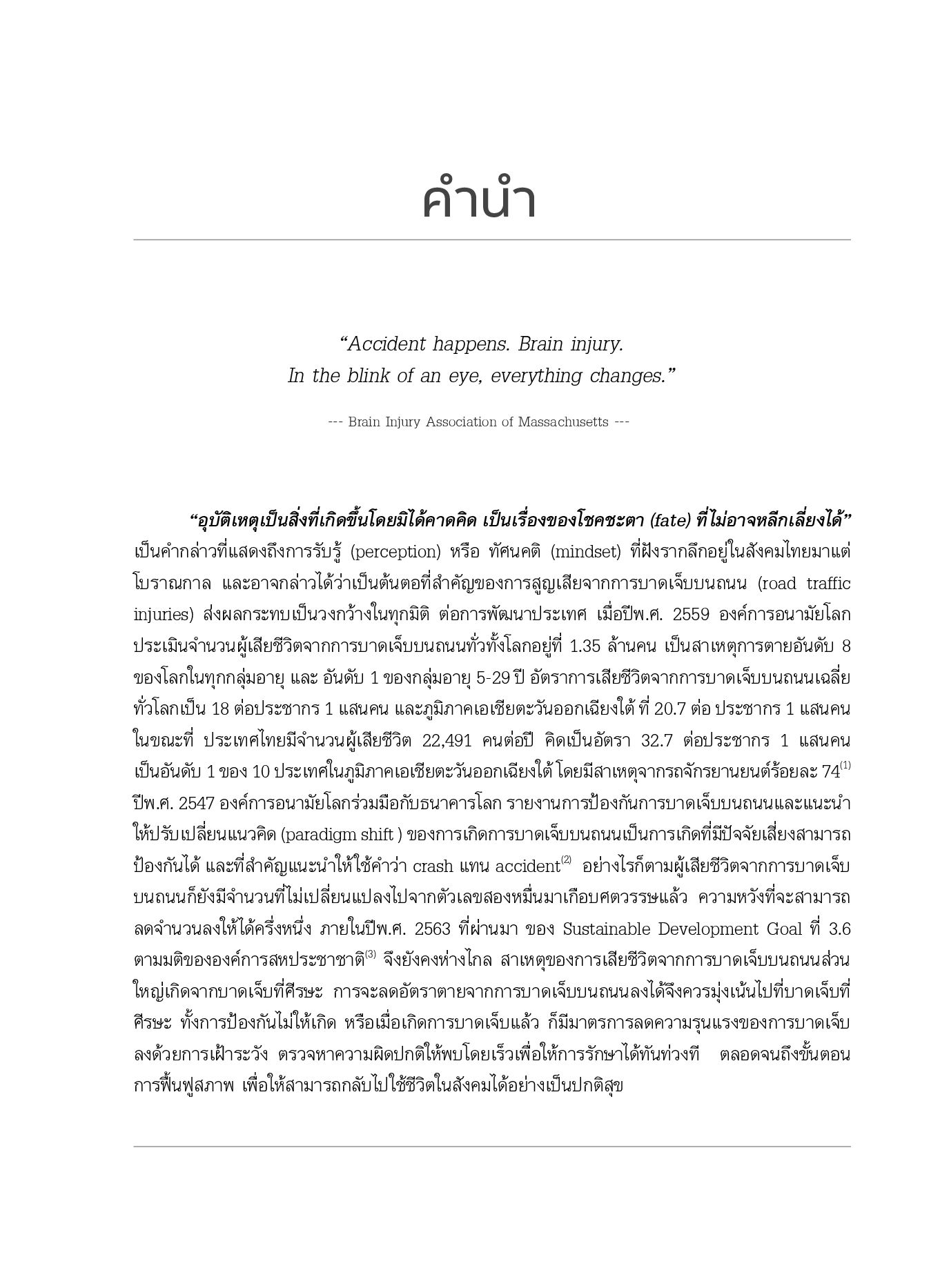 “อุบัติเหตุเป็นสิ่งที่เกิดขึ้นโดยมิได้คาดคิด เป็นเรื่องของโชคชะตา (fate) ที่ไม่อาจหลีกเลี่ยงได้” เป็นคำกล่าวที่แสดงถึงการรับรู้(perception) หรือ ทัศนคติ (mindset) ที่ฝังรากลึกอยู่ในสังคมไทยมาแต่โบราณกาล และอาจกล่าวได้ว่าเป็นต้นตอที่สำคัญของการสูญเสียจากการบาดเจ็บบนถนน (road traffic injuries) ส่งผลกระทบเป็นวงกว้างในทุกมิติต่อการพัฒนาประเทศ เมื่อปี พ.ศ. 2559 องค์การอนามัยโลกประเมินจำนวนผู้เสียชีวิตจากการบาดเจ็บบนถนนทั่วทั้งโลกอยู่ที่ 1.35 ล้านคน เป็นสาเหตุการตายอันดับ 8 ของโลกในทุกกลุ่มอายุและอันดับ 1 ของกลุ่มอายุ 5-29 ปีอัตราการเสียชีวิตจากการบาดเจ็บบนถนนเฉลี่ยทั่วโลกเป็น 18 ต่อประชากร 1 แสนคน และภูมิภาคเอเชียตะวันออกเฉียงใต้ที่ 20.7 ต่อประชากร 1 แสนคนในขณะที่ ประเทศไทยมีจำนวนผู้เสียชีวิต 22,491 คนต่อปีคิดเป็นอัตรา 32.7 ต่อประชากร 1 แสนคนเป็นอันดับ 1 ของ 10 ประเทศในภูมิภาคเอเชียตะวันออกเฉียงใต้โดยมีสาเหตุจากรถจักรยานยนต์ร้อยละ 74 ปี พ.ศ. 2547 องค์การอนามัยโลกร่วมมือกับธนาคารโลกรายงานการป้องกันการบาดเจ็บบนถนนและแนะนำให้ปรับเปลี่ยนแนวคิด (paradigm shift) ของการเกิดการบาดเจ็บบนถนนเป็นการเกิดที่มีปัจจัยเสี่ยงสามารถป้องกันได้และที่สำคัญแนะนำให้ใช้คำว่า crash แทน accident อย่างไรก็ตามผู้เสียชีวิตจากการบาดเจ็บบนถนนก็ยังมีจำนวนที่ไม่เปลี่ยนแปลงไปจากตัวเลขสองหมื่นมาเกือบศตวรรษแล้ว ความหวังที่จะสามารถลดจำนวนลงให้ได้ครึ่งหนึ่ง ภายในปี พ.ศ. 2563 ที่ผ่านมาของ Sustainable Development Goal ที่ 3.6 ตามมติขององค์การสหประชาชาติ จึงยังคงห่างไกล สาเหตุของการเสียชีวิตจากการบาดเจ็บบนถนนส่วนใหญ่เกิดจากบาดเจ็บที่ศีรษะ การจะลดอัตราตายจากการบาดเจ็บบนถนนลงได้จึงควรมุ่งเน้นไปที่บาดเจ็บที่ศีรษะ ทั้งการป้องกันไม่ให้เกิด หรือเมื่อเกิดการบาดเจ็บแล้ว ก็มีมาตรการลดความรุนแรงของการบาดเจ็บลงด้วยการเฝ้าระวัง ตรวจหาความผิดปกติให้พบโดยเร็วเพื่อให้การรักษาได้ทันท่วงที ตลอดจนถึงขั้นตอนการฟื้นฟูสภาพ เพื่อให้สามารถกลับไปใช้ชีวิตในสังคมได้อย่างเป็นปกติสุข