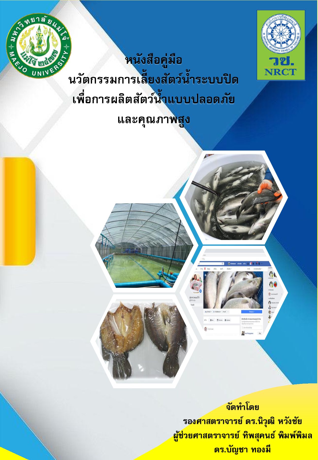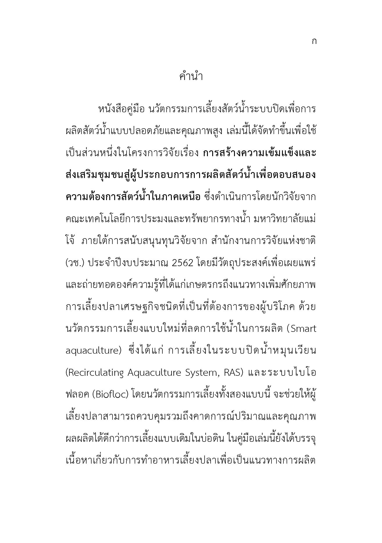 หนังสือคู่มือ นวัตกรรมการเลี้ยงสัตว์น้ําระบบปิดเพื่อการ ผลิตสัตว์น้ําแบบปลอดภัยและคุณภาพสูง เล่มนี้ได้จัดทําขึ้นเพื่อใช้ เป็นส่วนหนึ่งในโครงการวิจัยเรื่อง การสร้างความเข้มแข็งและ ส่งเสริมชุมชนสู่ผู้ประกอบการการผลิตสัตว์น้ําเพื่อตอบสนอง ความต้องการสัตว์น้ําในภาคเหนือ ซึ่งดําเนินการโดยนักวิจัยจาก คณะเทคโนโลยีการประมงและทรัพยากรทางน้ํา มหาวิทยาลัยแม่ โจ้ ภายใต้การสนับสนุนทุนวิจัยจาก สํานักงานการวิจัยแห่งชาติ (วช.) ประจําปีงบประมาณ 2562 โดยมีวัตถุประสงค์เพื่อเผยแพร่ และถ่ายทอดองค์ความรู้ที่ได้แก่เกษตรกรถึงแนวทางเพิ่มศักยภาพ การเลี้ยงปลาเศรษฐกิจชนิดที่เป็นที่ต้องการของผู้บริโภค ด้วย นวัตกรรมการเลี้ยงแบบใหม่ที่ลดการใช้น้ําในการผลิต (Smart aquaculture) ซึ่งได้แก่ การเลี้ยงในระบบปิดน้ําหมุนเวียน (Recirculating Aquaculture System, RAS) และระบบไบโอ ฟลอค (Biofloc) โดยนวัตกรรมการเลี้ยงทั้งสองแบบนี้ จะช่วยให้ผู้ เลี้ยงปลาสามารถควบคุมรวมถึงคาดการณ์ปริมาณและคุณภาพ ผลผลิตได้ดีกว่าการเลี้ยงแบบเดิมในบ่อดิน ในคู่มือเล่มนี้ยังได้บรรจุ เนื้อหาเกี่ยวกับการทําอาหารเลี้ยงปลาเพื่อเป็นแนวทางการผลิต