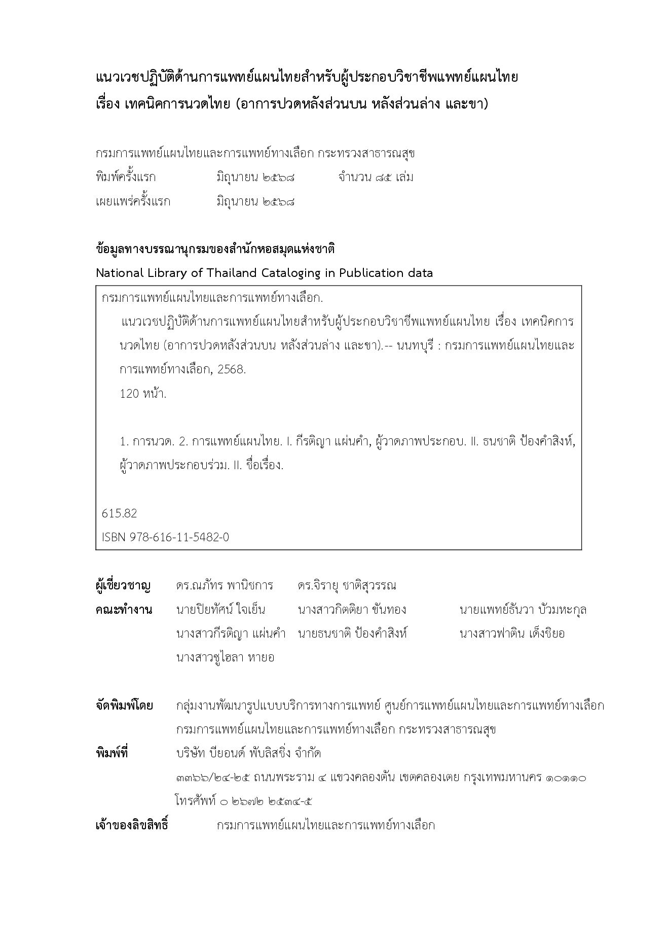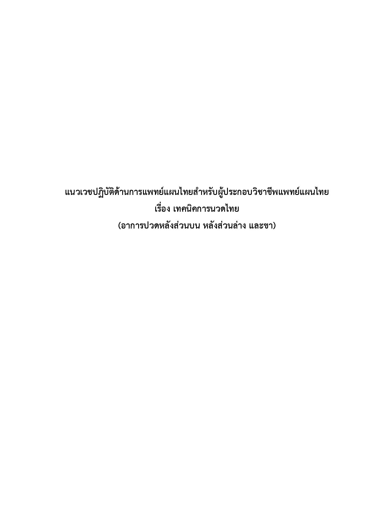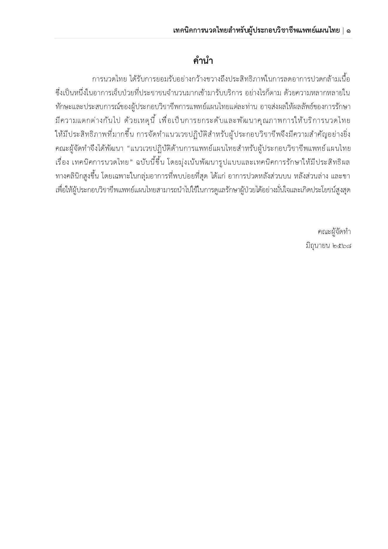 การนวดไทย ได้รับการยอมรับอย่างกว้างขวางถึงประสิทธิภาพในการลดอาการปวดกล้ามเนื้อ ซึ่งเป็นหนึ่งในอาการเจ็บป่วยที่ประชาชนจานวนมากเข้ามารับบริการ อย่างไรก็ตาม ด้วยความหลากหลายใน ทักษะและประสบการณ์ของผู้ประกอบวิชาชีพการแพทย์แผนไทยแต่ละท่าน อาจส่งผลให้ผลลัพธ์ของการรักษา มีความแตกต่างกันไป ด้วยเหตุนี้ เพื่อเป็นการยกระดับและพัฒนาคุณภาพการให้บริการนวดไทย ให้มีประสิทธิภาพที่มากขึ้น การจัดทาแนวเวชปฏิบัติสาหรับผู้ประกอบวิชาชีพจึงมีความสาคัญอย่างยิ่ง คณะผู้จัดทาจึงได้พัฒนา “แนวเวชปฏิบัติด้านการแพทย์แผนไทยสาหรับผู้ประกอบวิชาชีพแพทย์แผนไทย เรื่อง เทคนิคการนวดไทย” ฉบับนี้ขึ้น โดยมุ่งเน้นพัฒนารูปแบบและเทคนิคการรักษาให้มีประสิทธิผล ทางคลินิกสูงขึ้น โดยเฉพาะในกลุ่มอาการที่พบบ่อยที่สุด ได้แก่ อาการปวดหลังส่วนบน หลังส่วนล่าง และขา เพื่อให้ผู้ประกอบวิชาชีพแพทย์แผนไทยสามารถนาไปใช้ในการดูแลรักษาผู้ป่วยได้อย่างมั่นใจและเกิดประโยชน์สูงสุด