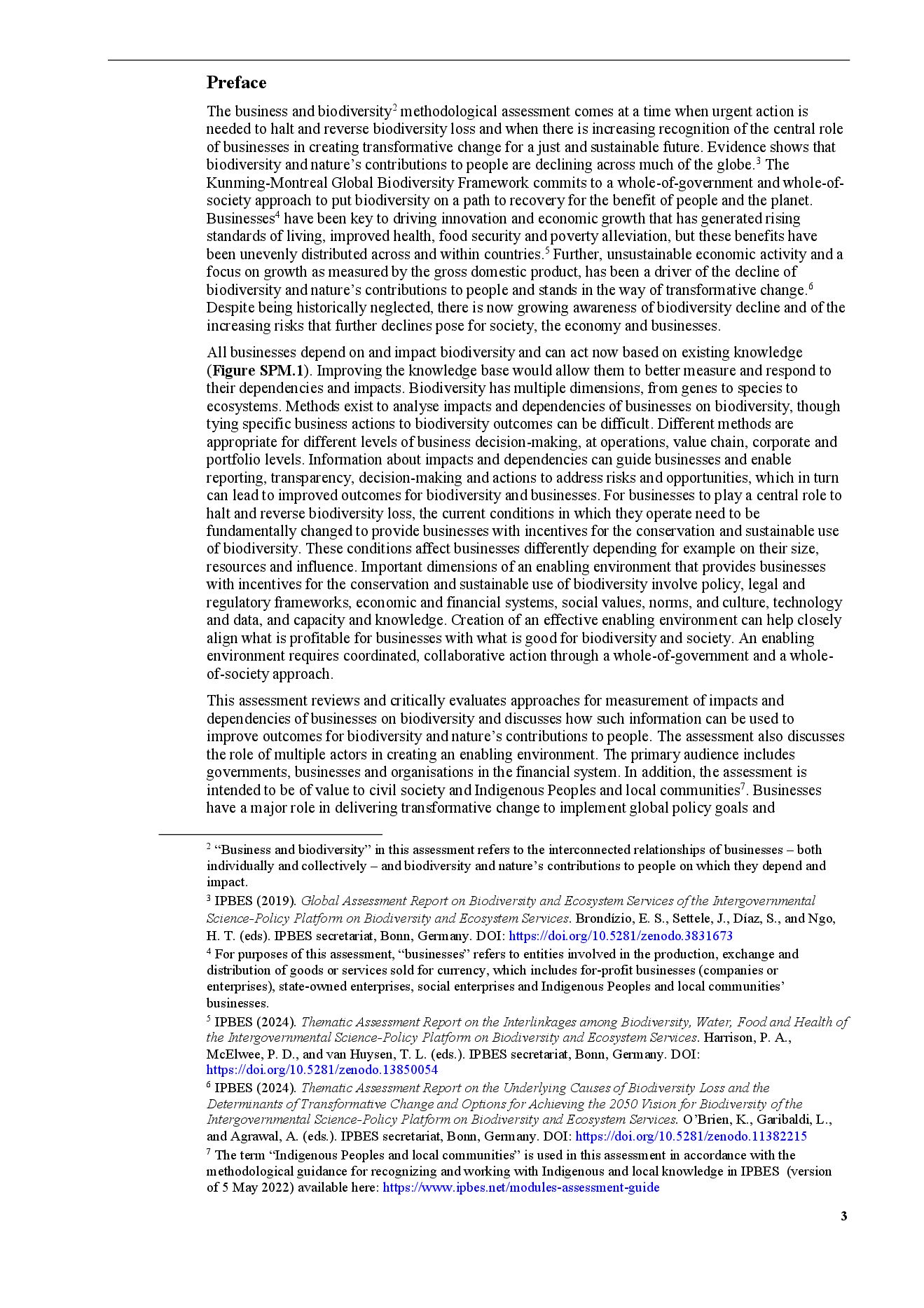 The business and biodiversity2 methodological assessment comes at a time when urgent action is needed to halt and reverse biodiversity loss and when there is increasing recognition of the central role of businesses in creating transformative change for a just and sustainable future. Evidence shows that biodiversity and nature’s contributions to people are declining across much of the globe.3 The Kunming-Montreal Global Biodiversity Framework commits to a whole-of-government and whole-of- society approach to put biodiversity on a path to recovery for the benefit of people and the planet. Businesses4 have been key to driving innovation and economic growth that has generated rising standards of living, improved health, food security and poverty alleviation, but these benefits have been unevenly distributed across and within countries.5 Further, unsustainable economic activity and a focus on growth as measured by the gross domestic product, has been a driver of the decline of biodiversity and nature’s contributions to people and stands in the way of transformative change.6 Despite being historically neglected, there is now growing awareness of biodiversity decline and of the increasing risks that further declines pose for society, the economy and businesses.