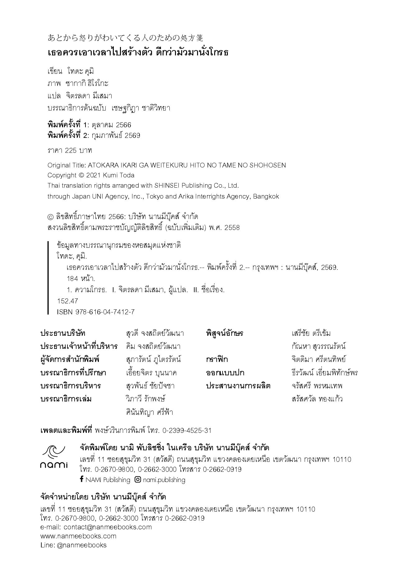 ปวดใจที่ต้องทำงานกับคนที่เรายกโทษให้ไม่ได้ในอดีต, ไม่อาจลืมคำพูดที่พ่อแม่เคยปรามาสไว้ว่า “แกมันไม่ได้เรื่อง!”, นึกถึงคำร้องเรียนอันไร้เหตุผลของลูกค้าจนนอนไม่หลับ,นึกถึงตอนที่หัวหน้าข่มเหงรังแกในที่ทำงานแล้วก็รู้สึกอยากแก้แค้นทุกที, โมโหที่เพื่อนไม่คืนเงิน...แถมยังไม่แม้แต่จะติดต่อมา! หากคุณเคยมีปัญหาเหล่านี้ เจ็บแค้นเคืองโกรธจนวางไม่ลง เรามีใบสั่งยาที่ช่วยคุณได้! หนังสือ “เธอควรเอาเวลาไปสร้างตัว ดีกว่ามัวมานั่งโกรธ” เล่มนี้หยิบยกกรณีศึกษามากมายเกี่ยวกับความโกรธและวิธีจัดการความโกรธที่ปะทุกลับมา ครอบคลุมทุกความสัมพันธ์ทั้งกับคนที่ทำงาน ครอบครัว คนรัก เพื่อน ไปจนถึงความโกรธที่เกิดขึ้นในสถานการณ์ต่าง ๆ ทั้งยังเผยวิธีระบายความทุกข์และสร้างความสุขที่ช่วยให้รับมือกับความโกรธได้ดียิ่งขึ้น