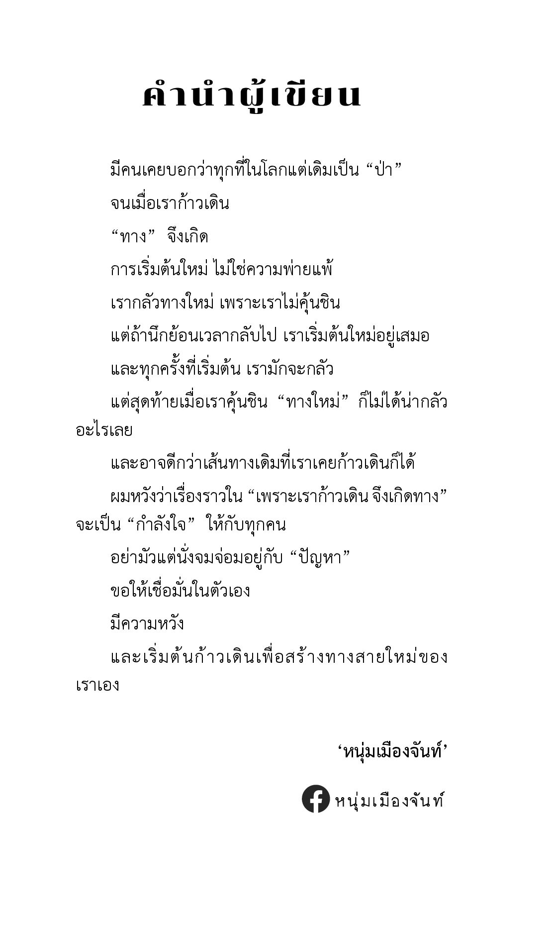 อย่ากลัวจนลืมความกล้า อย่ามัวทุกข์กับปัญหา จนไม่กล้าเปลี่ยนแปลง การเริ่มต้นใหม่ ไม่ใช่ความพ่ายแพ้ ขอเพียงแค่มีศรัทธาและเชื่อมั่นในตัวเอง อย่าลืมว่าโลกใบนี้ไม่เคยมี "ทาง" มาก่อน ทุกที่ล้วนเป็นป่ารก จนเมื่อเราก้าวเดิน "ทาง" จึงเกิด