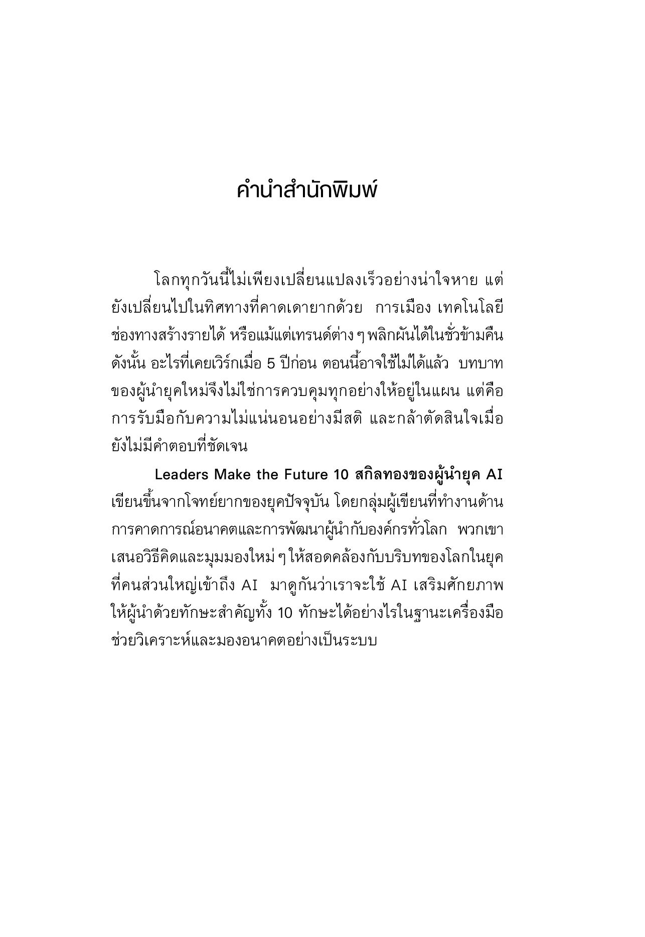 โลกวันนี้เปลี่ยนเร็วเกินกว่าที่ใครจะตามทัน ความผันผวน ความไม่แน่นอน และความซับซ้อนกลายเป็นเรื่องปกติใหม่ จากโลกแบบ VUCA สู่โลกแบบ BANI ที่ทั้งเปราะบาง น่ากังวล และเข้าใจได้ยาก คำถามสำคัญจึงไม่ใช่แค่ว่าเราจะ “อยู่รอด” อย่างไรในวันที่ AI ฉลาดและรวดเร็วขึ้นทุกวัน แต่คือเราจะ “เติบโตในฐานะผู้นำ” อย่างไรในโลกที่เปลี่ยนแปลงอยู่ตลอดเวลา หนังสือ “Leaders Make the Future 10 สกิลทองของผู้นำยุค AI” ชี้ให้เห็นว่า ภาวะผู้นำยุคใหม่ไม่ใช่การตั้งรับหรือยึดติดกับความสำเร็จเดิม แต่คือการลุกขึ้นมาสร้างอนาคตในแบบที่ต้องการ ไม่มองว่าการเปลี่ยนแปลงคืออุปสรรค แต่เป็นสนามให้ทดลอง คิดใหม่ และลงมือทำก่อนใคร หนังสือเล่มนี้นำเสนอโลกแบบ BANI ด้านดีที่เปลี่ยนมุมมองจากความปั่นป่วนให้กลายเป็นโอกาส พร้อม 10 ทักษะแห่งผู้นำอนาคตที่จำเป็นต่อการขับเคลื่อนองค์กรในโลกจริง ตั้งแต่การลงมือสร้างสิ่งใหม่อย่างรวดเร็วด้วยสัญชาติญาณนักปฏิบัติ การตัดสินใจท่ามกลางความไม่ชัดเจน การเรียนรู้จากความล้มเหลวผ่านการทดลองและสร้างต้นแบบ ไปจนถึงการรวมพลังผู้คนและผู้ช่วยอัจฉริยะให้เกิดแรงขับเคลื่อนที่ทรงพลัง แก่นสำคัญของหนังสือคือ ผู้นำที่แท้จริงในยุคนี้ไม่ใช่ผู้ที่รอให้อนาคตมาถึง แต่คือผู้ที่ “ลงมือสร้างมันขึ้นมา” และนี่ไม่ใช่ตำราผู้นำแบบเดิม หากเป็นเข็มทิศสำหรับผู้ที่ต้องการเอาชนะความไม่แน่นอน และกำหนดทิศทางอนาคตด้วยมือของตนเองอย่างแท้จริง